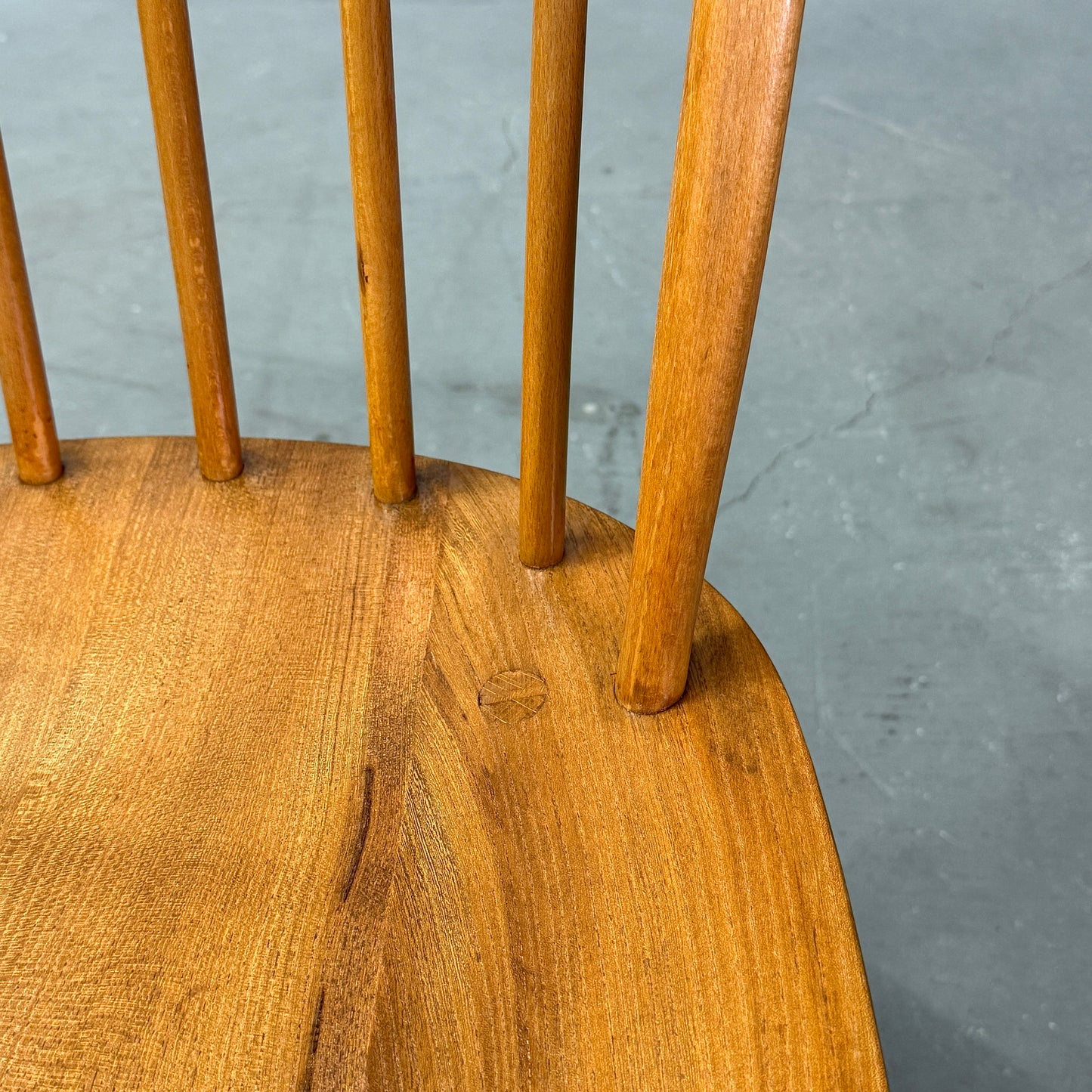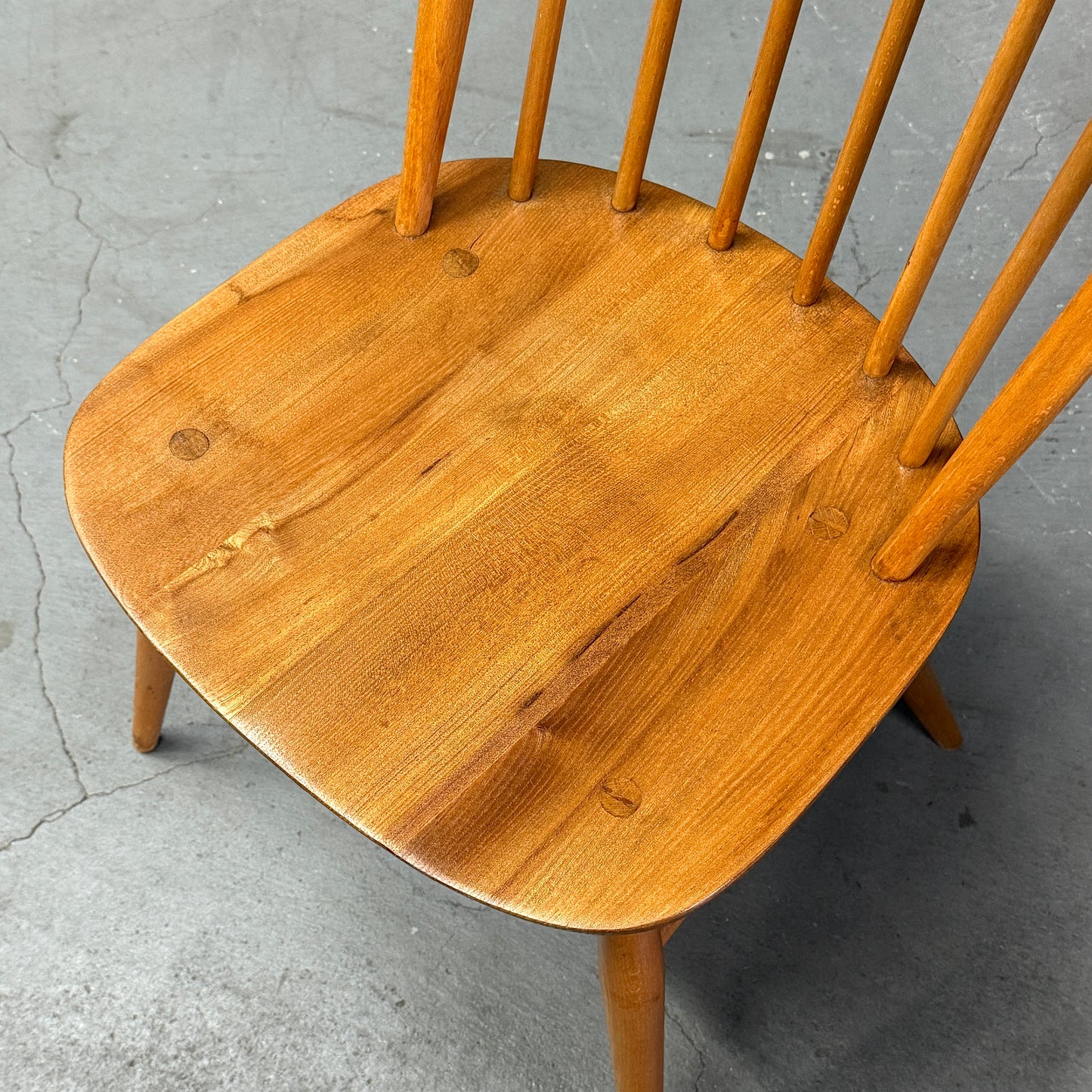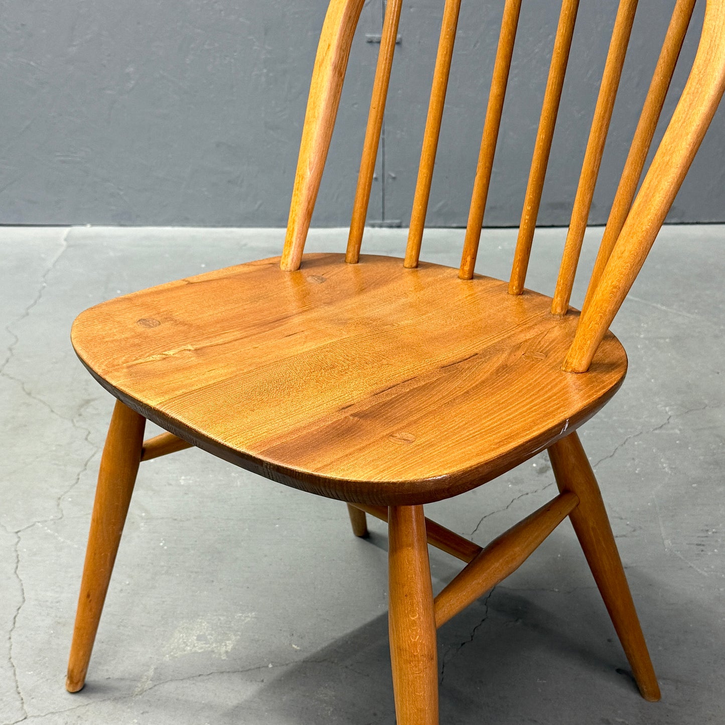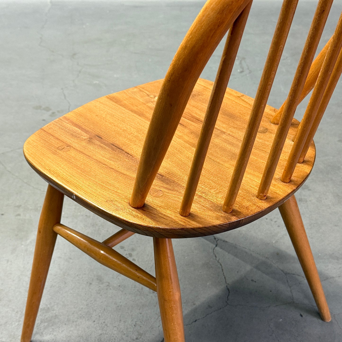 ERCOLのウィンザーチェアの中でもベーシックなアイテムです。背もたれに取り付けられた6本のスピンドルとオイスター型の座面が特徴的で、弓形のシートバックになっています。1958年に同社が発表し、チェアのフレームはブナ材、背もたれのスピンドルはブナ材、オイスター型のシートは無垢のニレ材から作られています。クエーカーチェアやゴールドスミスチェア等と比べ小さめサイズ感で、お部屋のちょっとした場所に飾り棚としても利用される事が多いアイテムです。