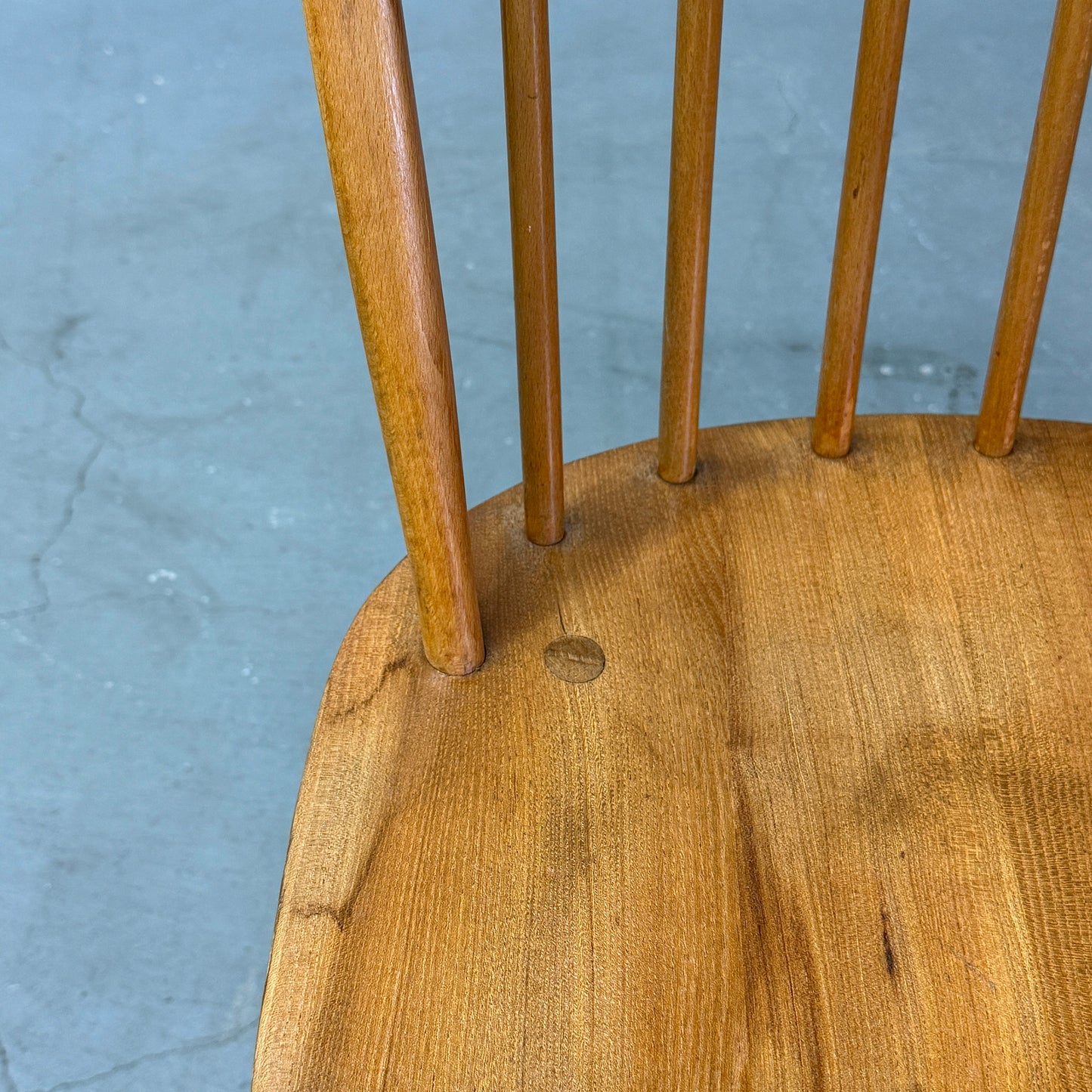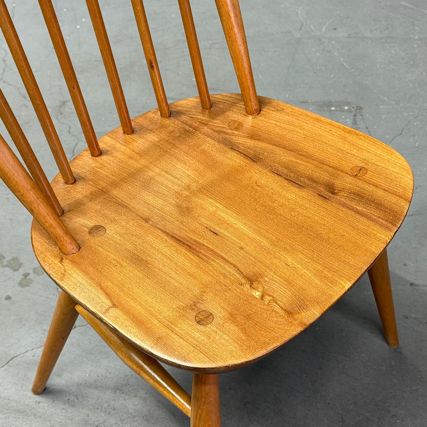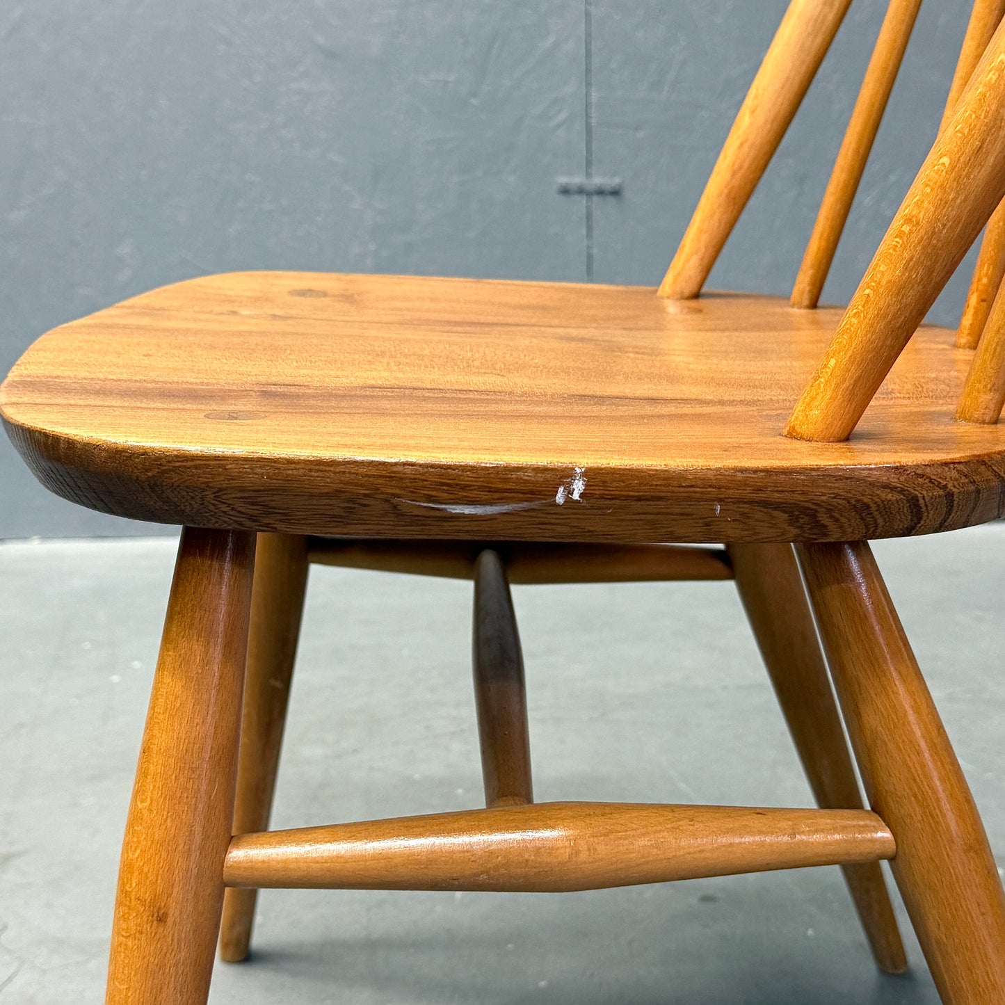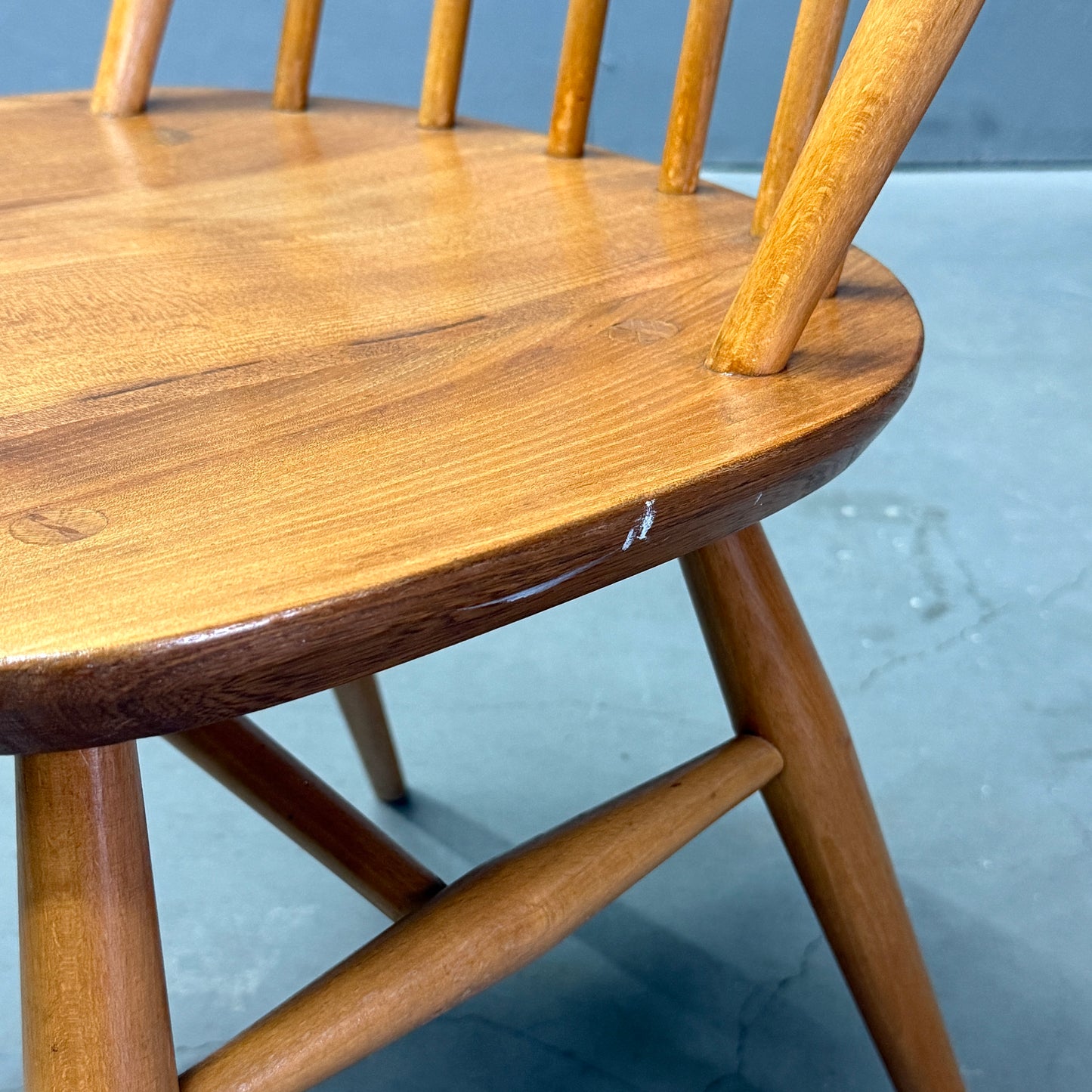 ERCOLのウィンザーチェアの中でもベーシックなアイテムです。背もたれに取り付けられた6本のスピンドルとオイスター型の座面が特徴的で、弓形のシートバックになっています。1958年に同社が発表し、チェアのフレームはブナ材、背もたれのスピンドルはブナ材、オイスター型のシートは無垢のニレ材から作られています。クエーカーチェアやゴールドスミスチェア等と比べ小さめサイズ感で、お部屋のちょっとした場所に飾り棚としても利用される事が多いアイテムです。