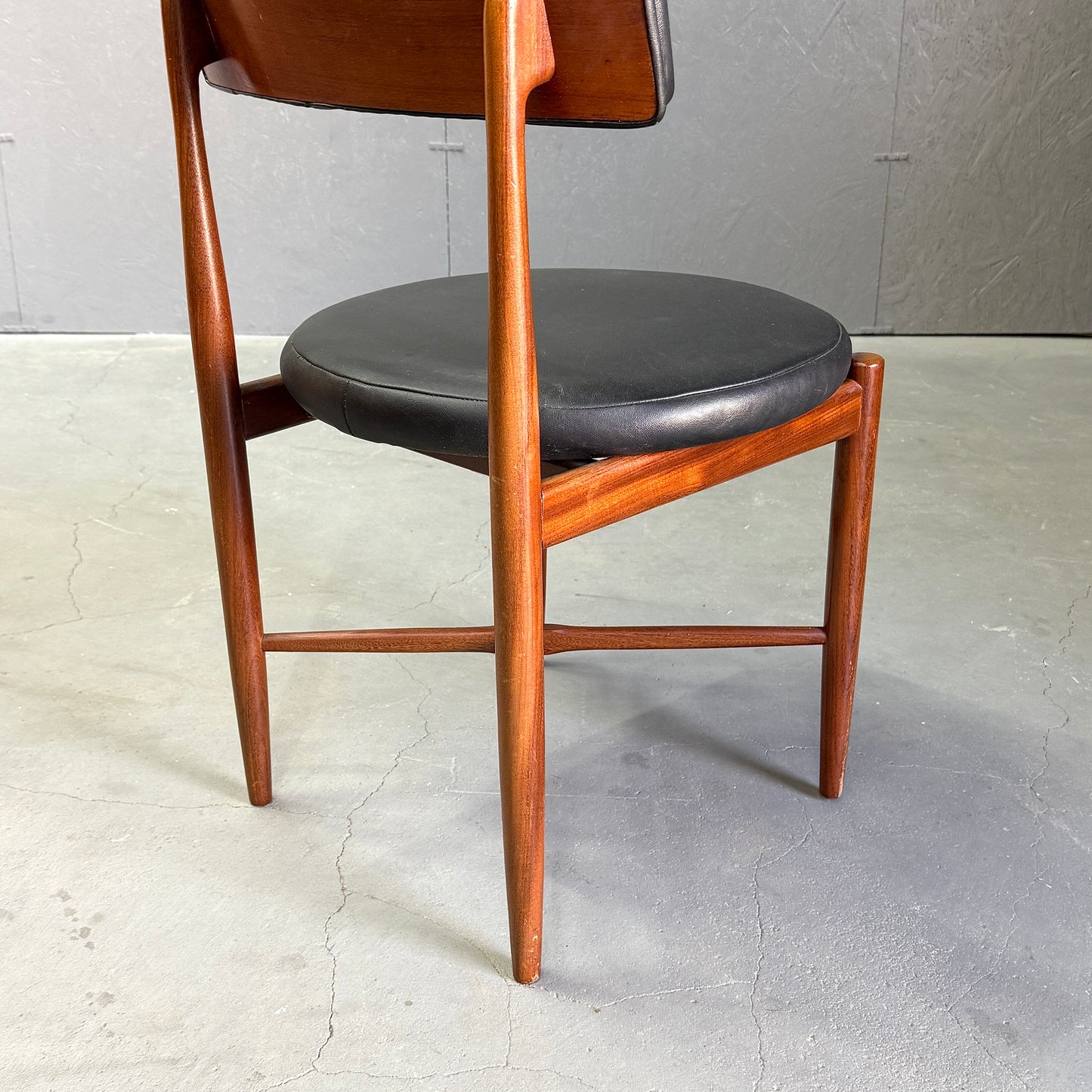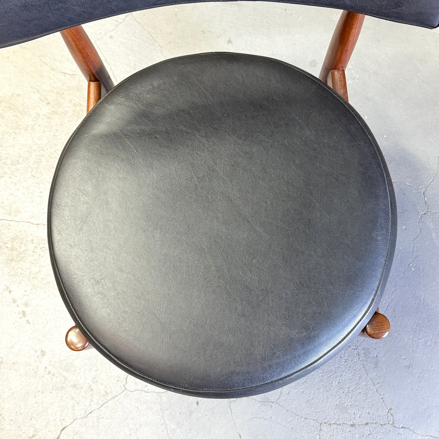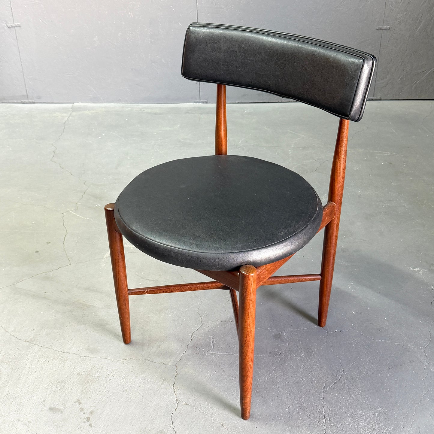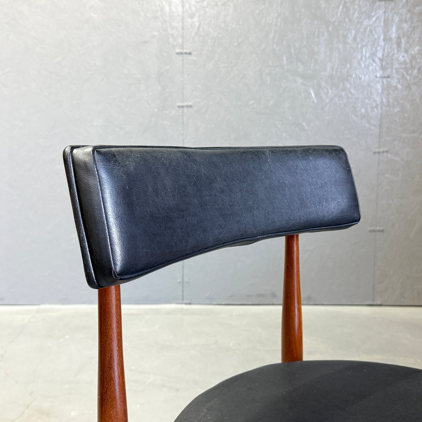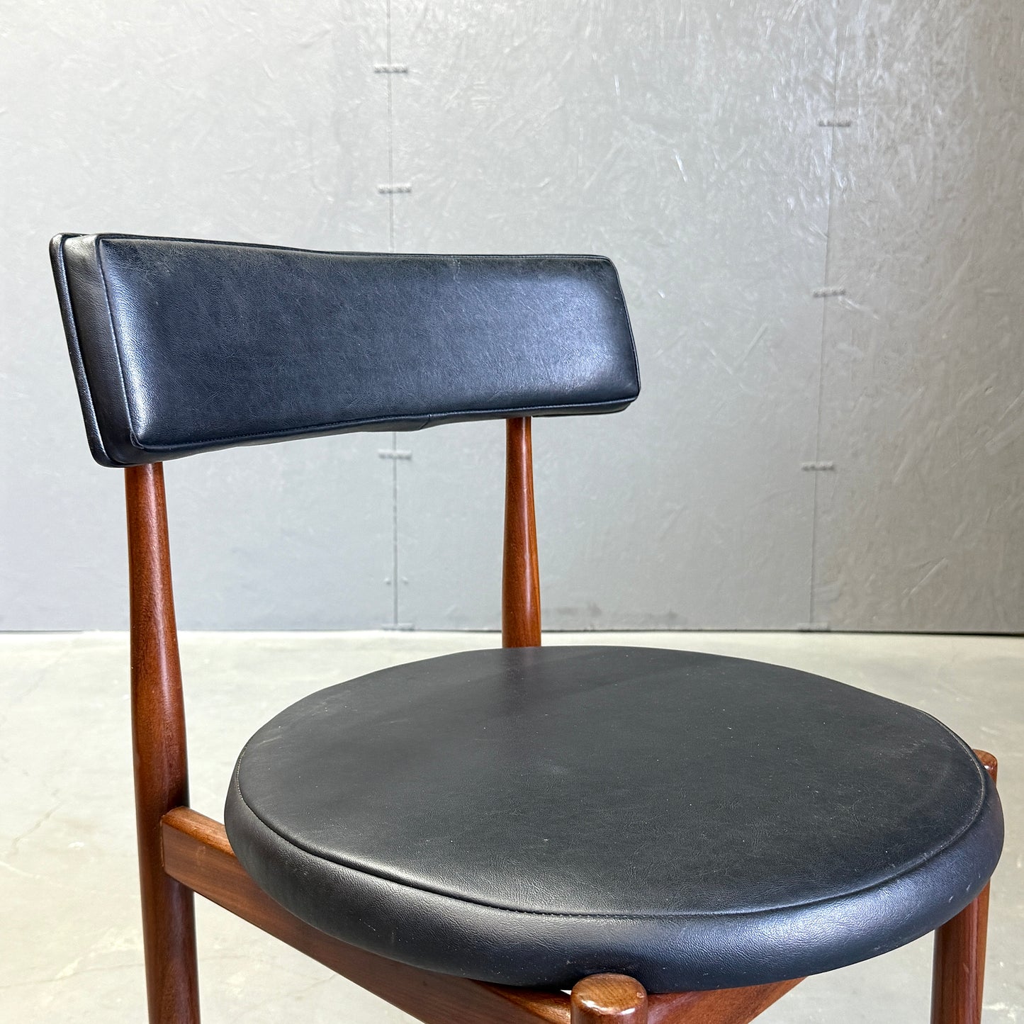 チーク材にブラックビニールのシートベースと背もたれが付いたフレスコシリーズのサーキュラーチェアです。脚はテーパーしており、背もたれは緩やかなカーブを描いています。単体としてはもちろん、円形のダイニングテーブルとセットで組み合わせるとスカンディナビアンテイストが強まります。