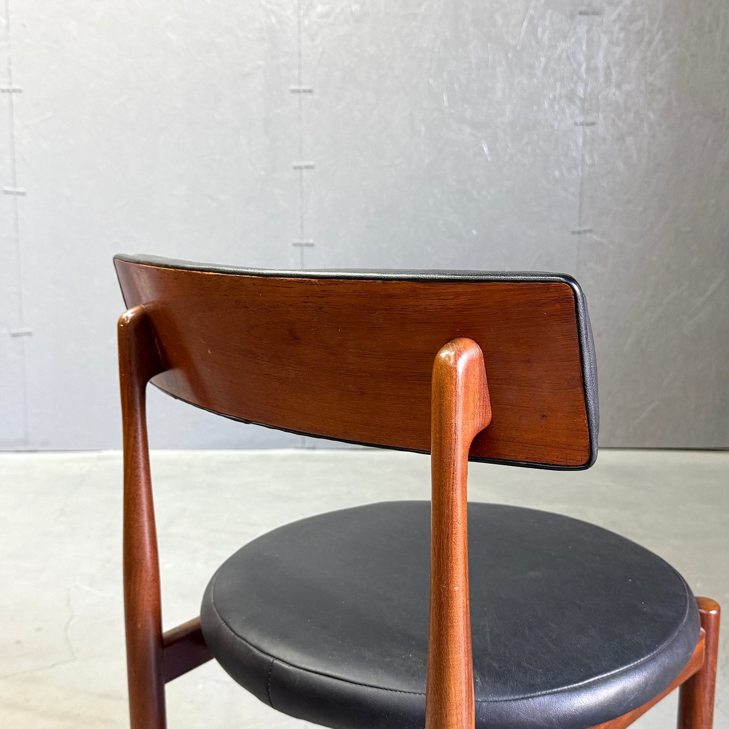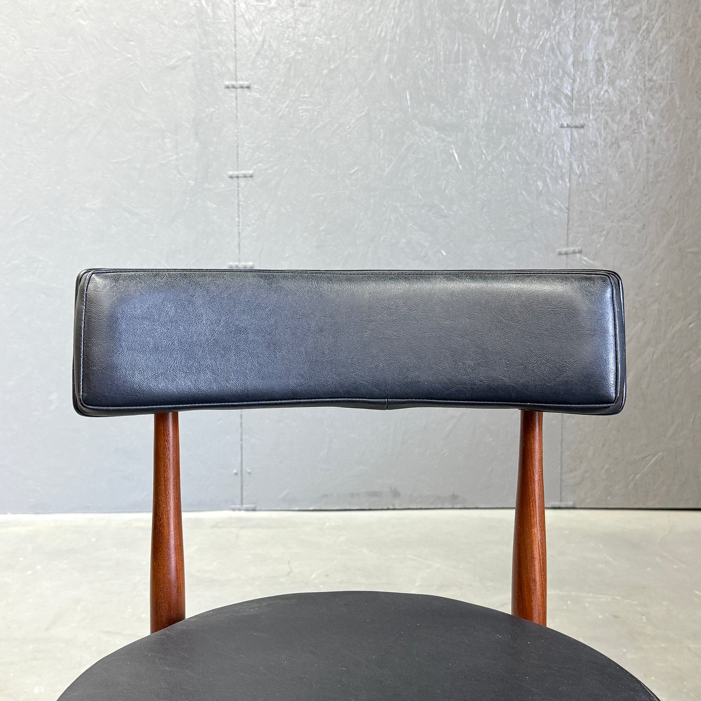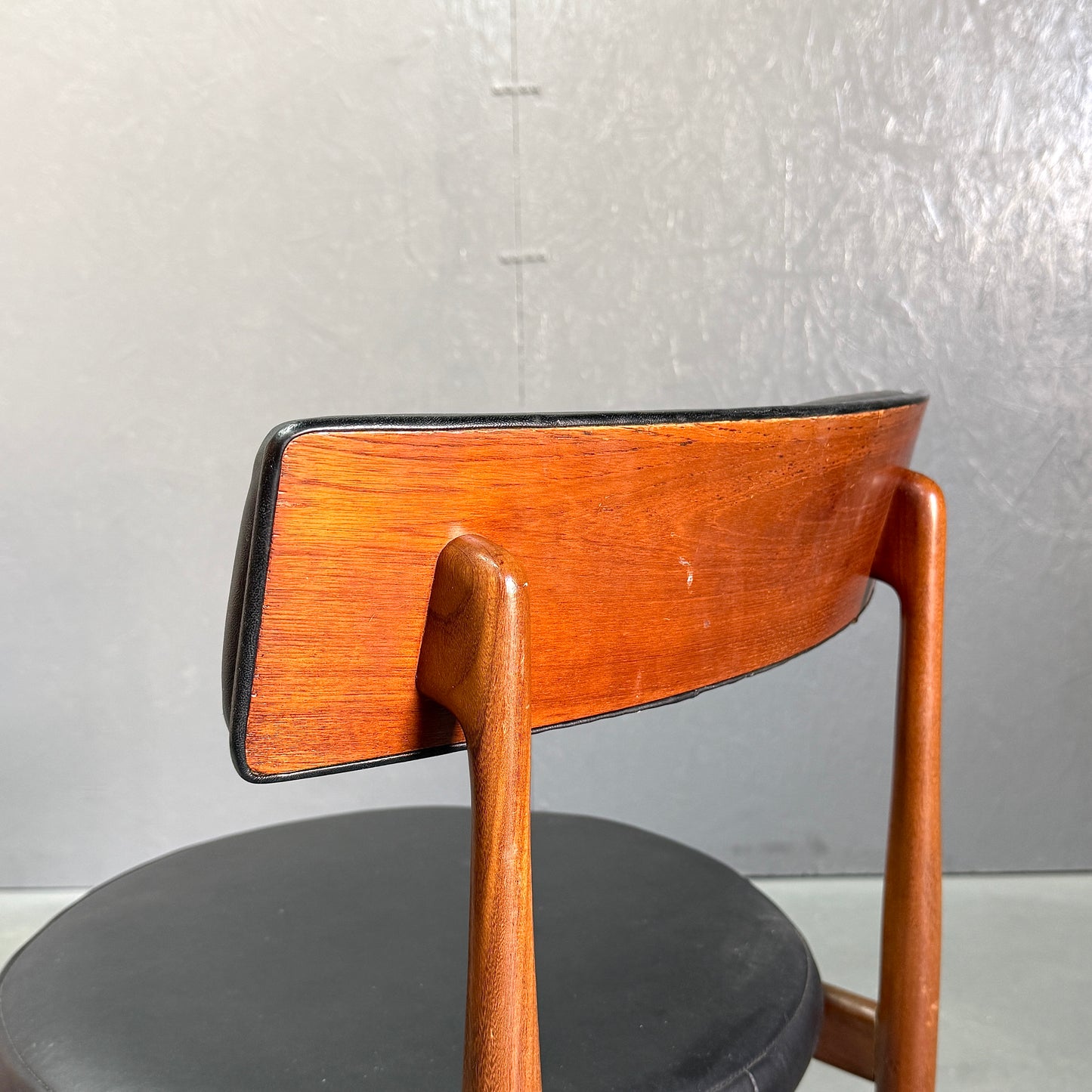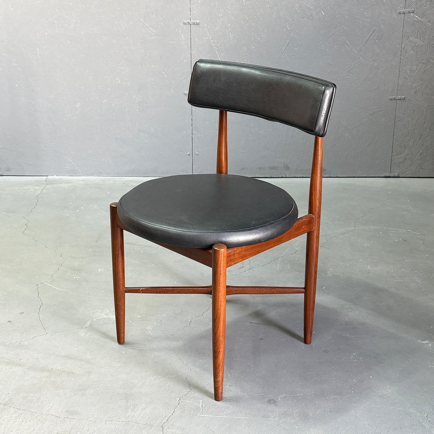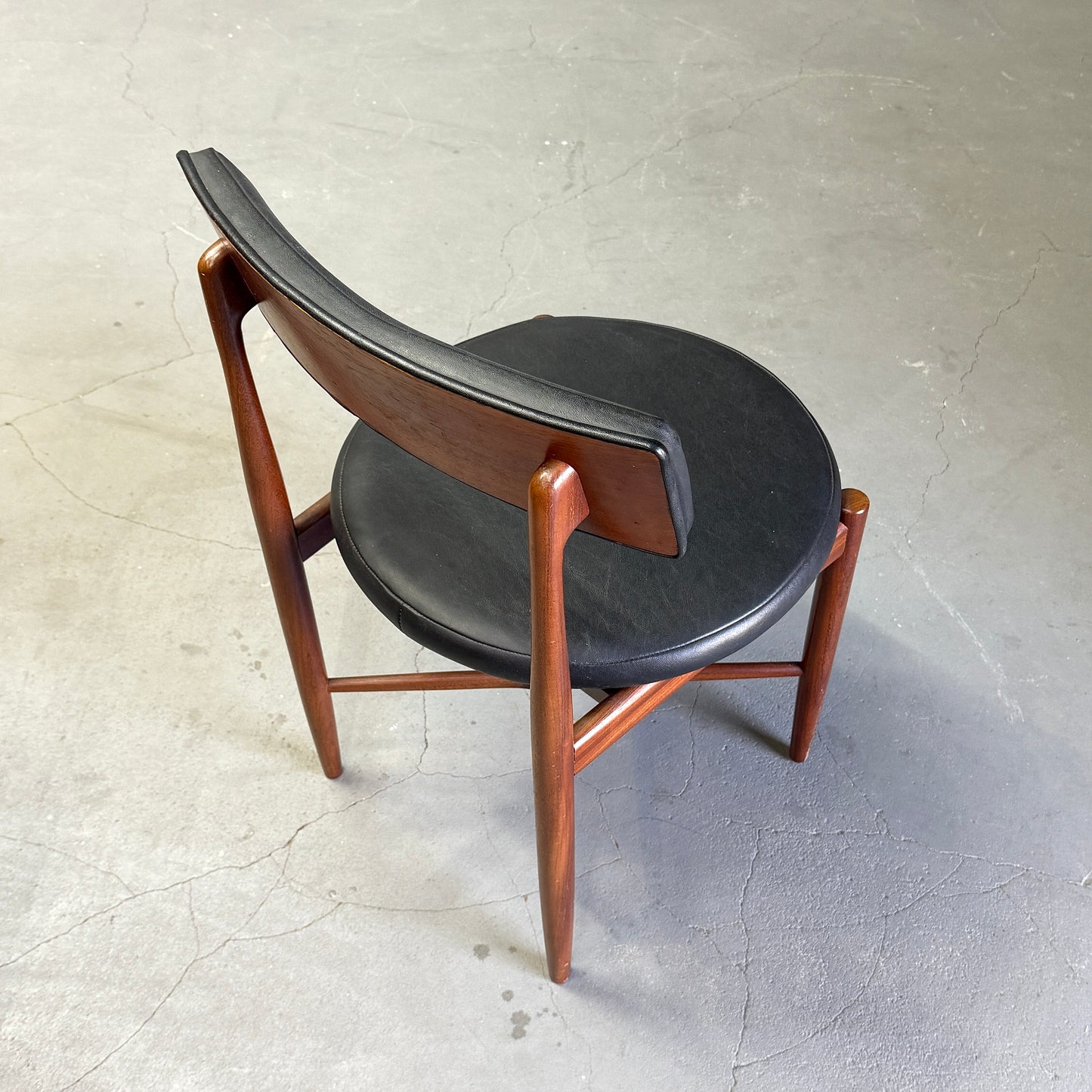 チーク材にブラックビニールのシートベースと背もたれが付いたフレスコシリーズのサーキュラーチェアです。脚はテーパーしており、背もたれは緩やかなカーブを描いています。単体としてはもちろん、円形のダイニングテーブルとセットで組み合わせるとスカンディナビアンテイストが強まります。