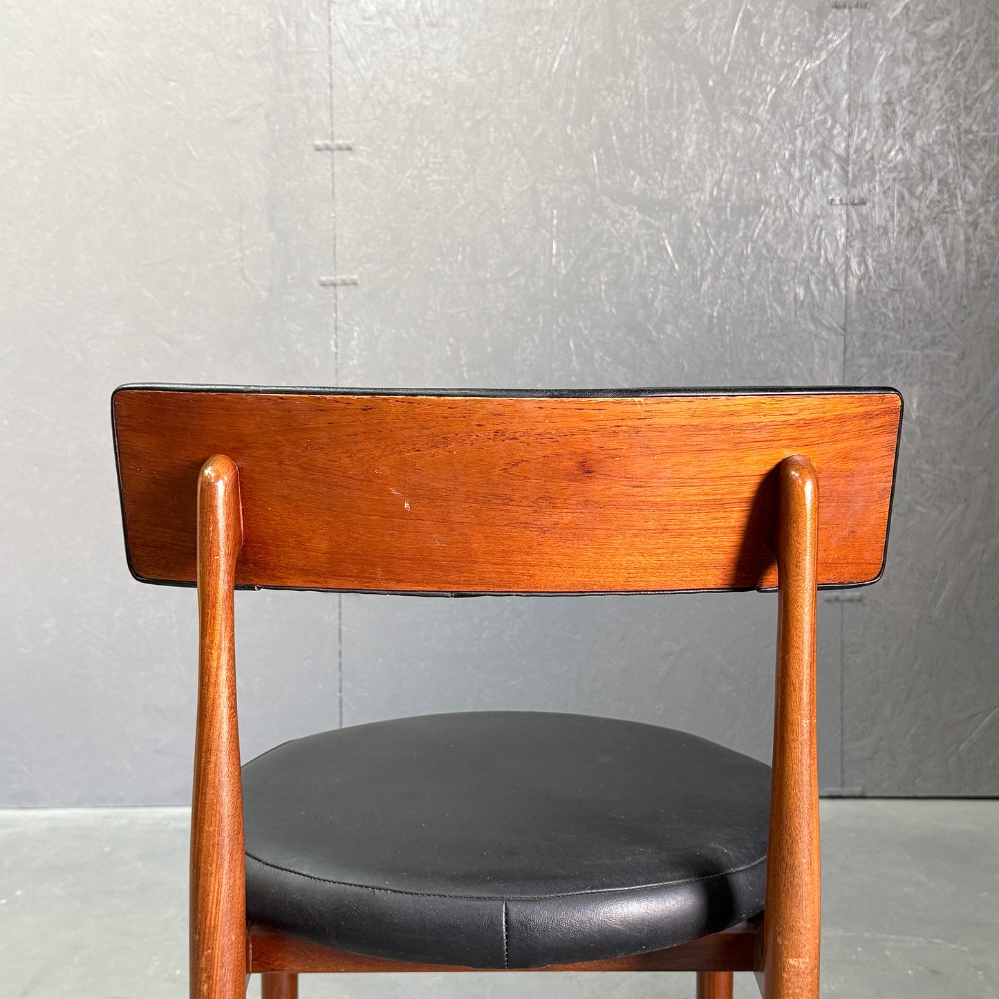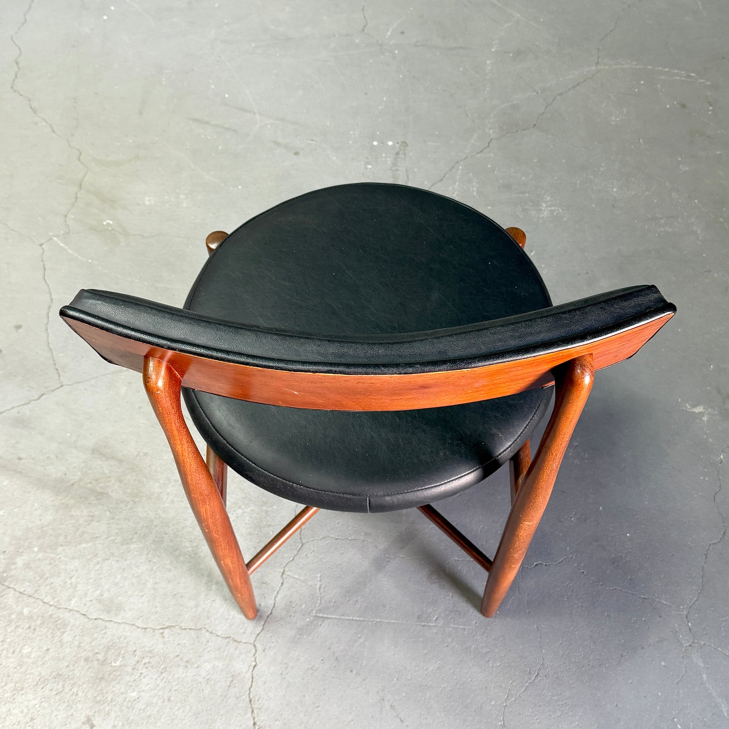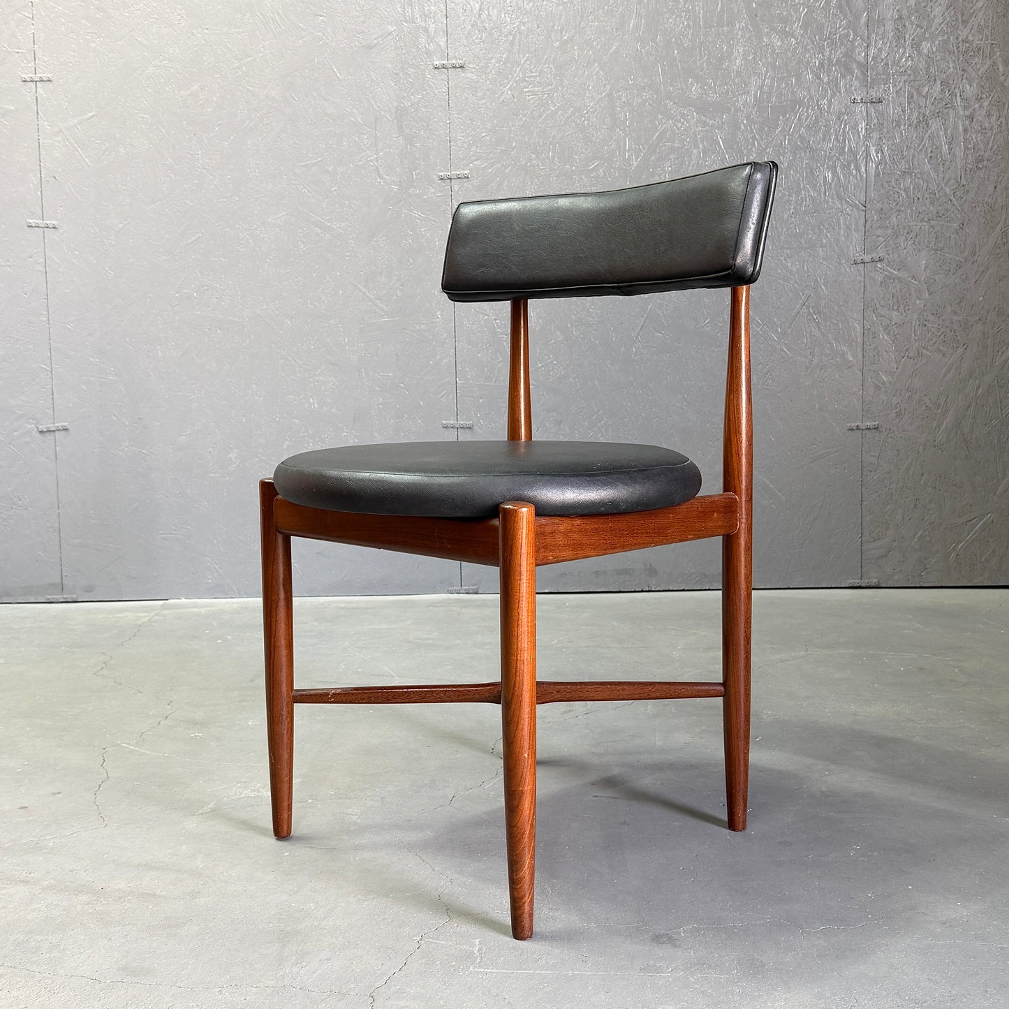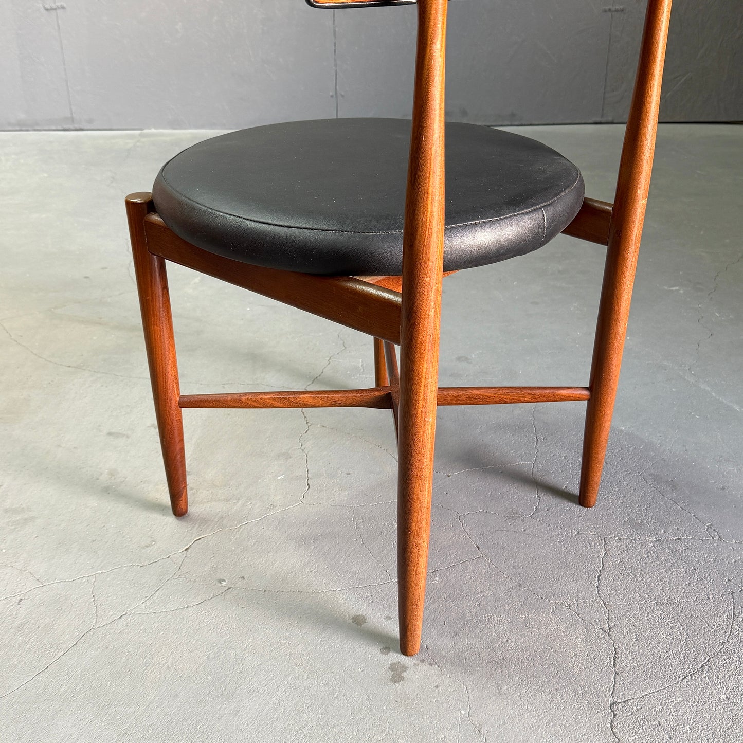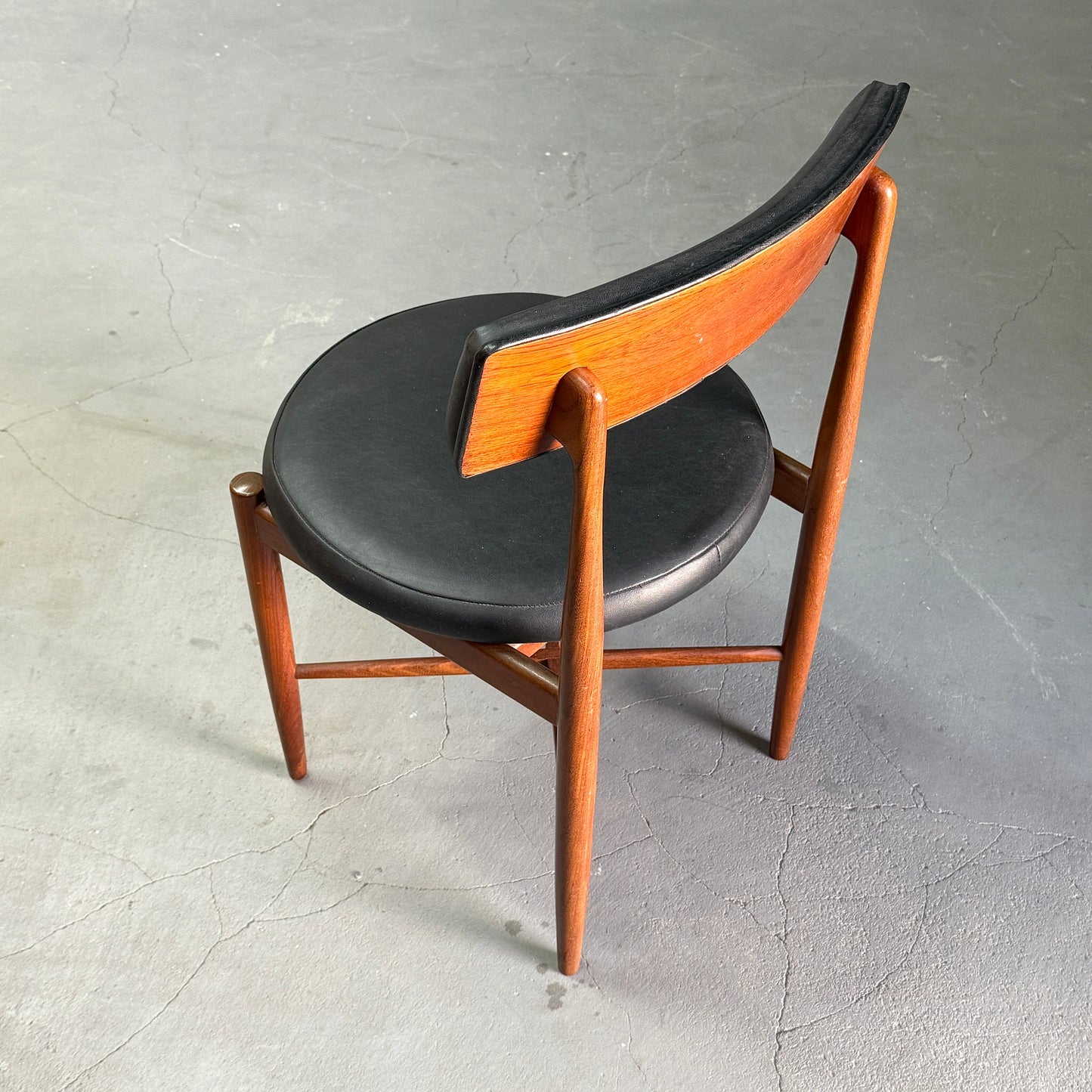 チーク材にブラックビニールのシートベースと背もたれが付いたフレスコシリーズのサーキュラーチェアです。脚はテーパーしており、背もたれは緩やかなカーブを描いています。単体としてはもちろん、円形のダイニングテーブルとセットで組み合わせるとスカンディナビアンテイストが強まります。