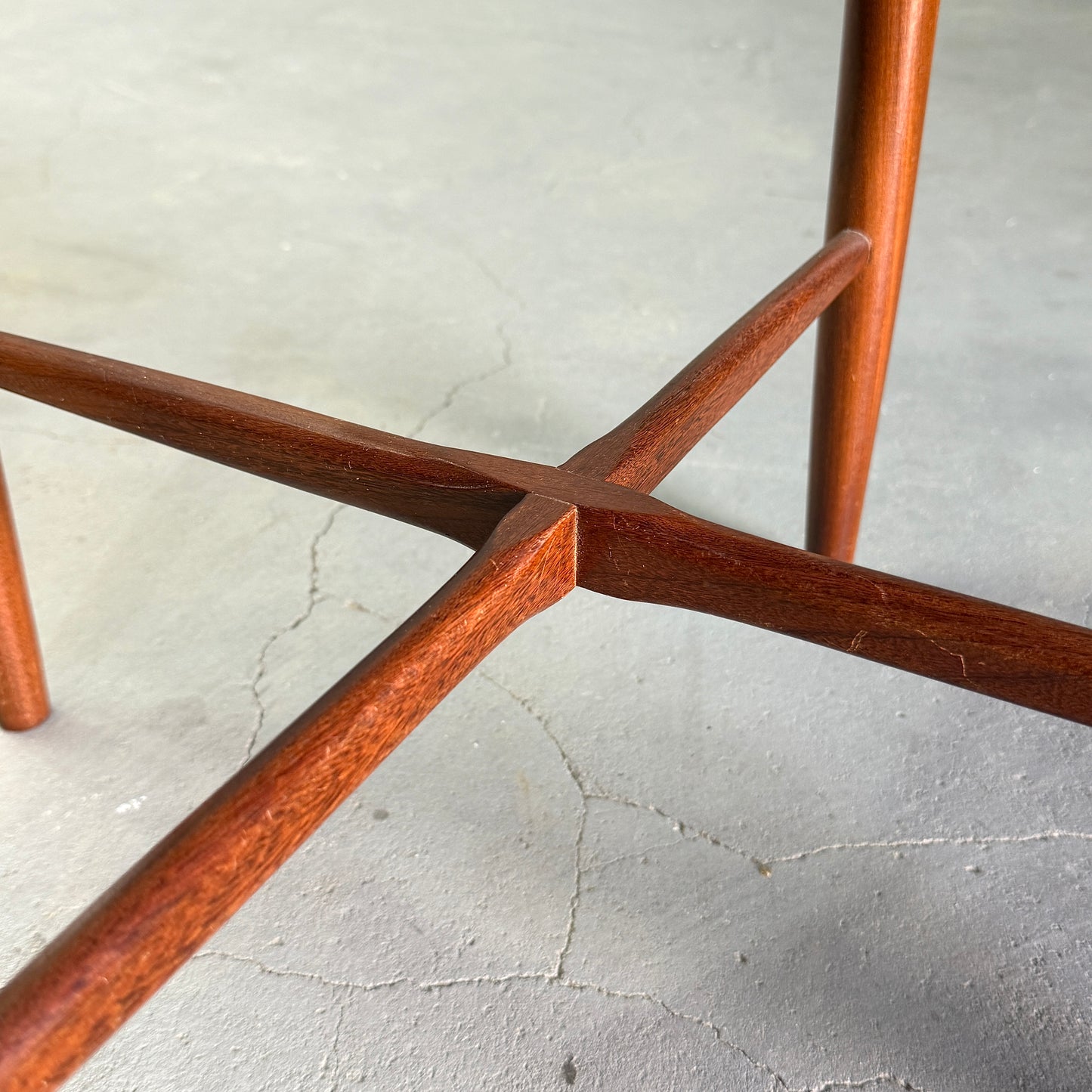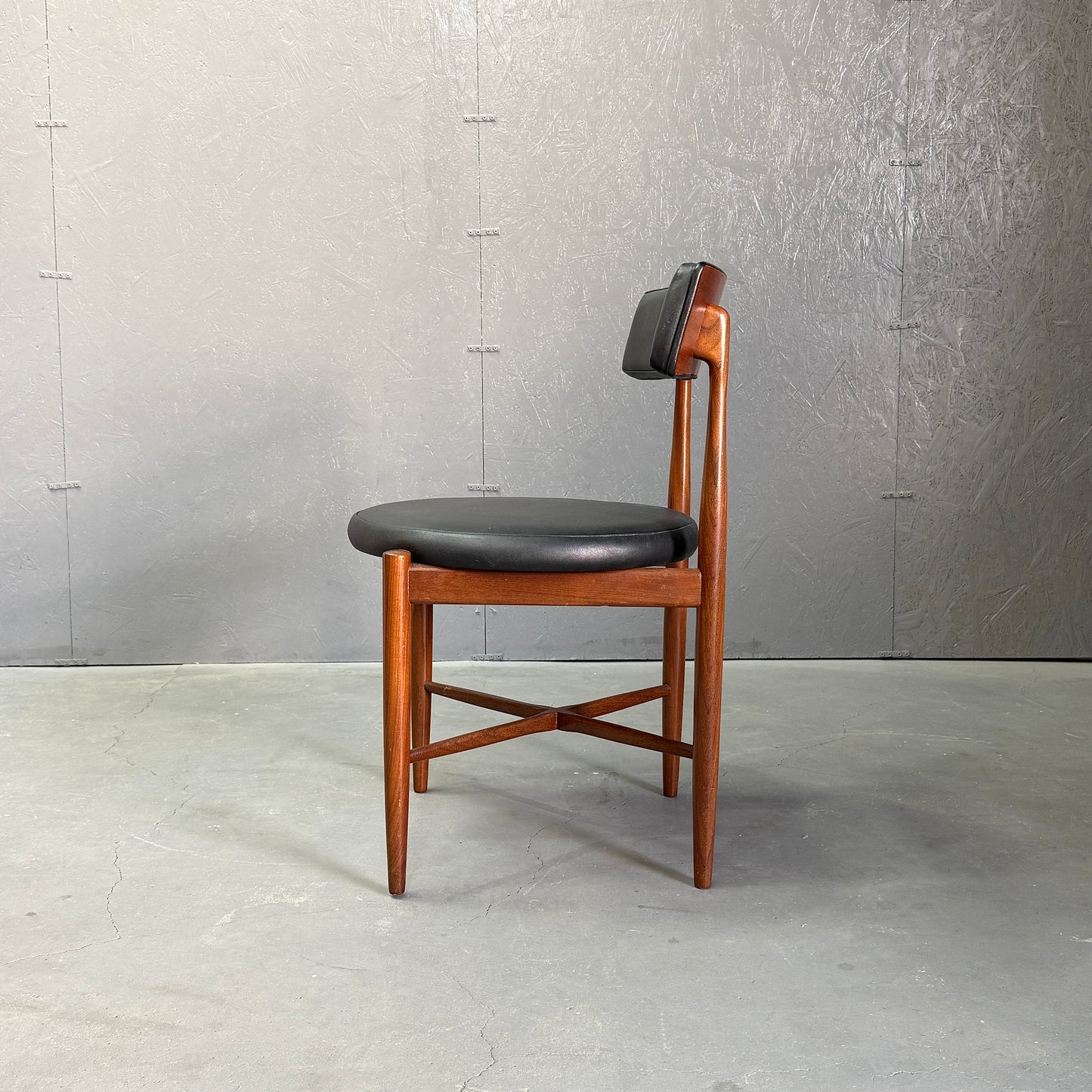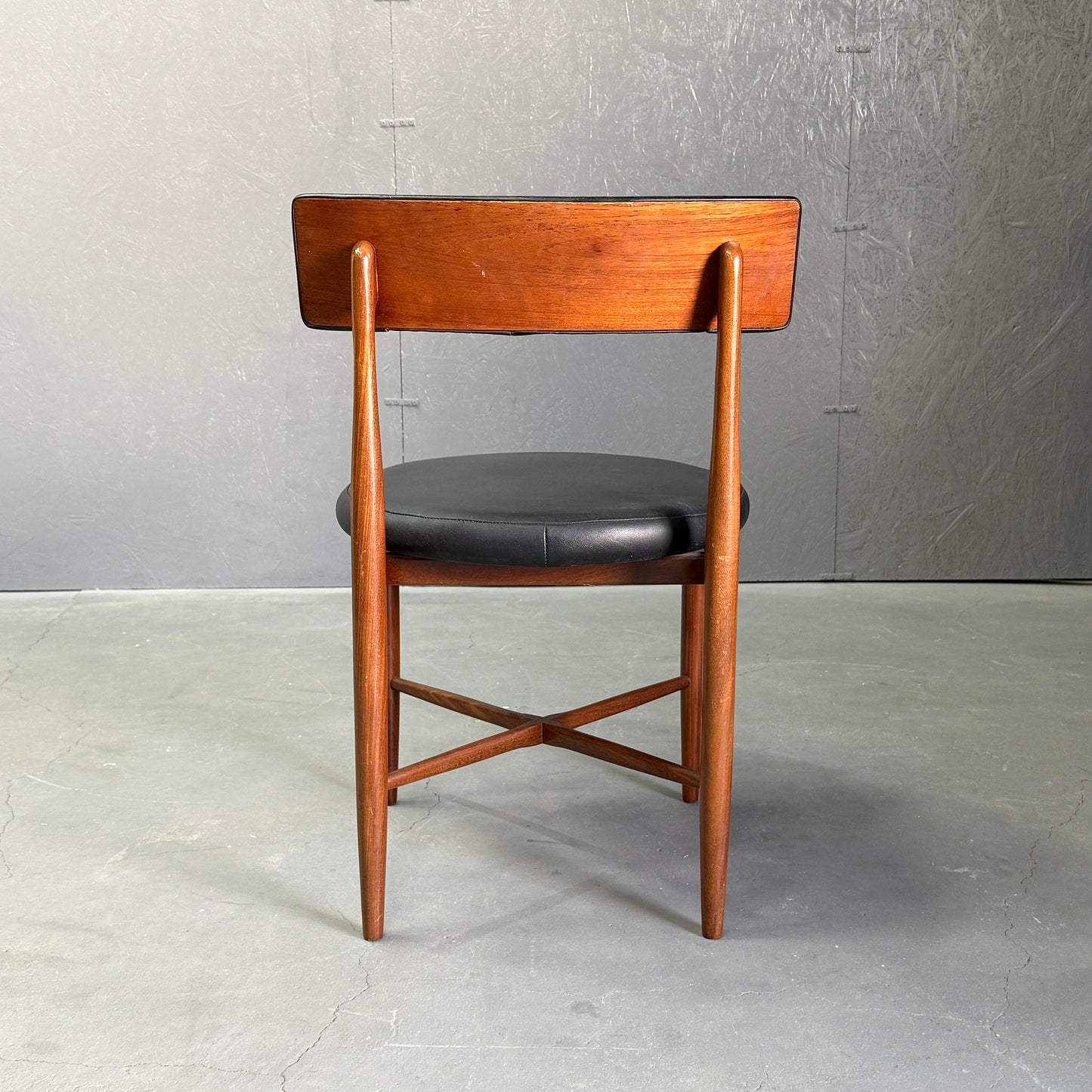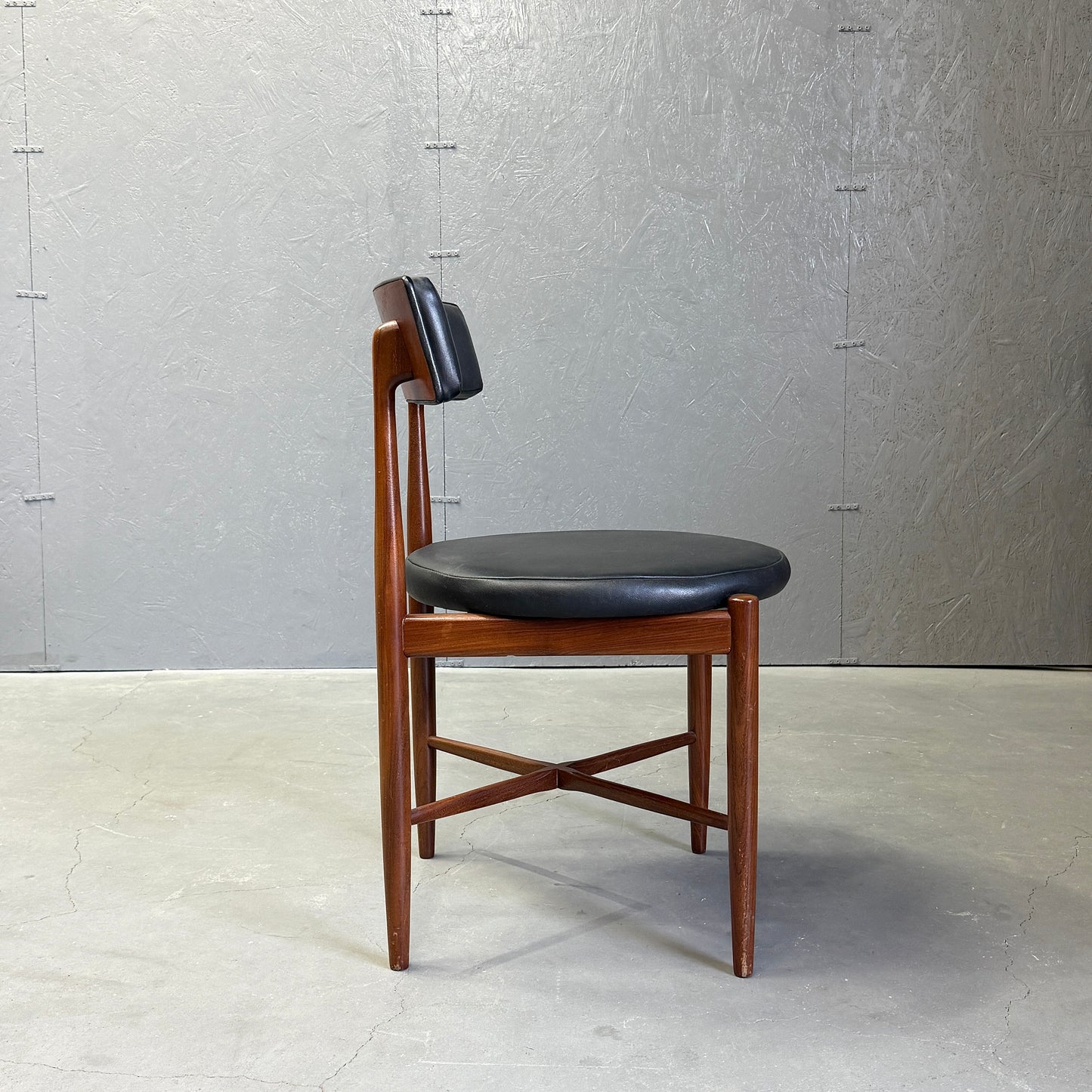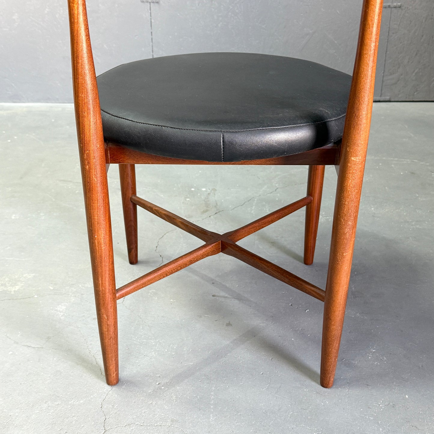 チーク材にブラックビニールのシートベースと背もたれが付いたフレスコシリーズのサーキュラーチェアです。脚はテーパーしており、背もたれは緩やかなカーブを描いています。単体としてはもちろん、円形のダイニングテーブルとセットで組み合わせるとスカンディナビアンテイストが強まります。