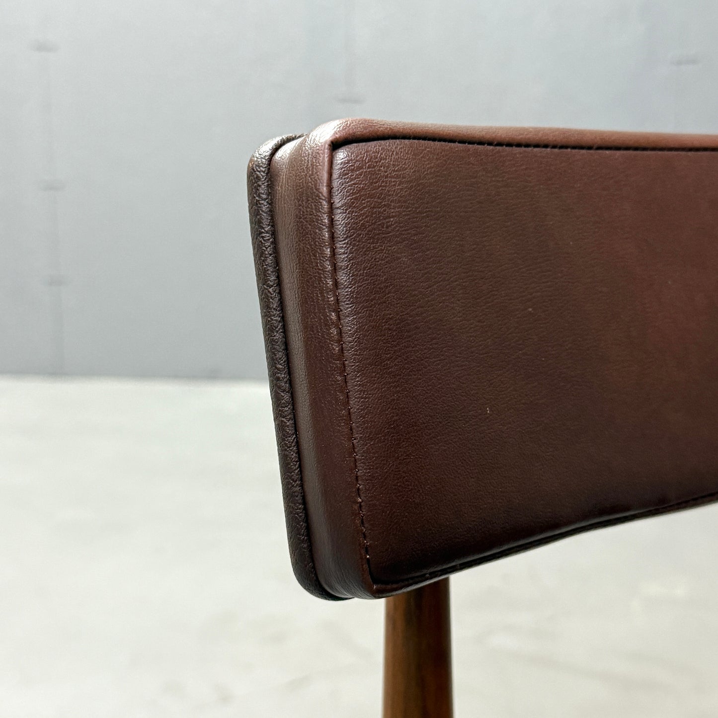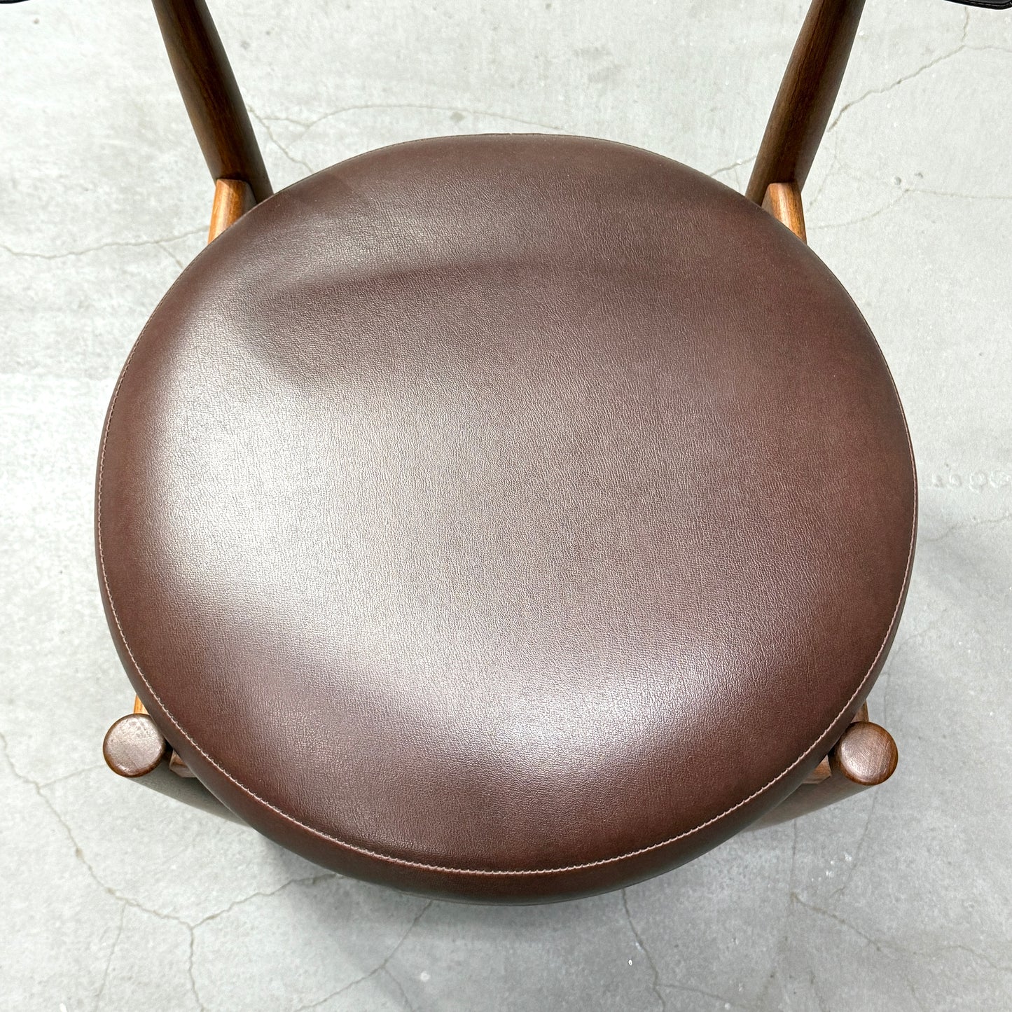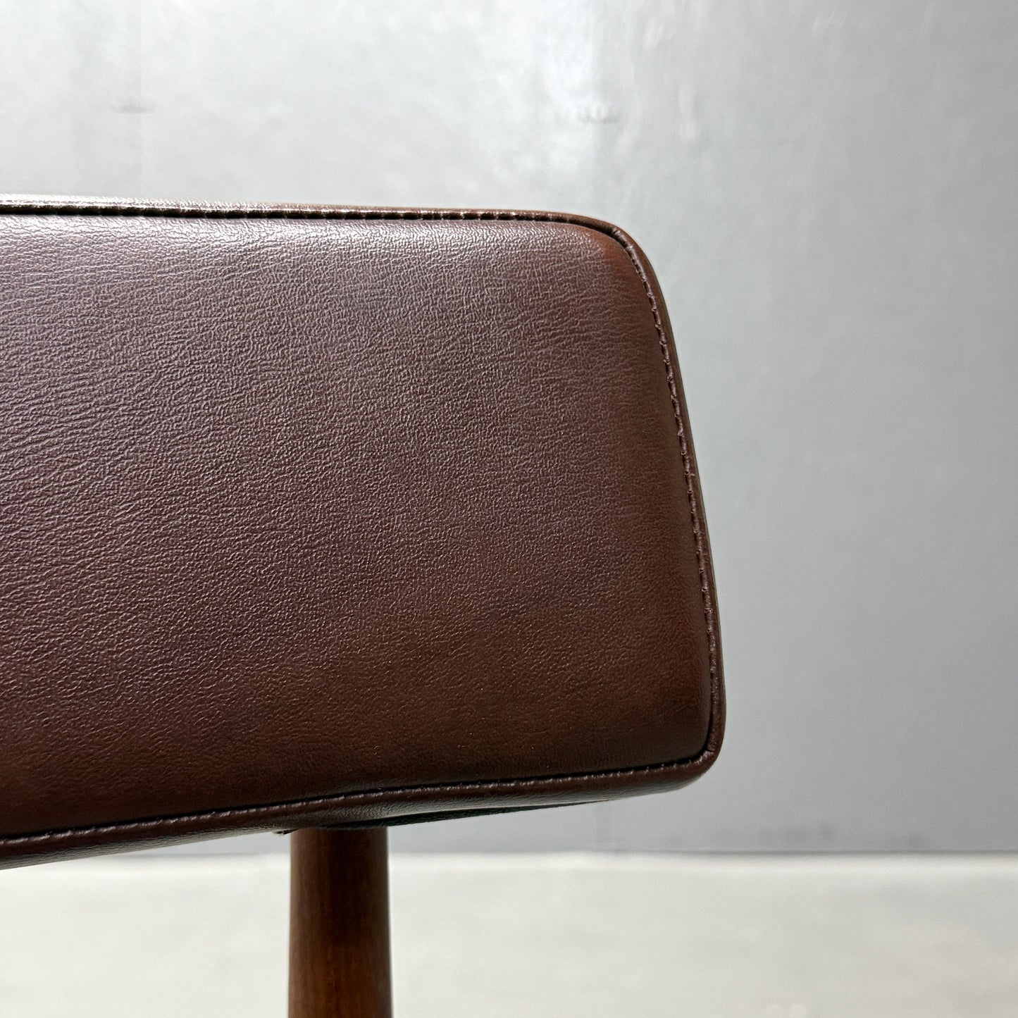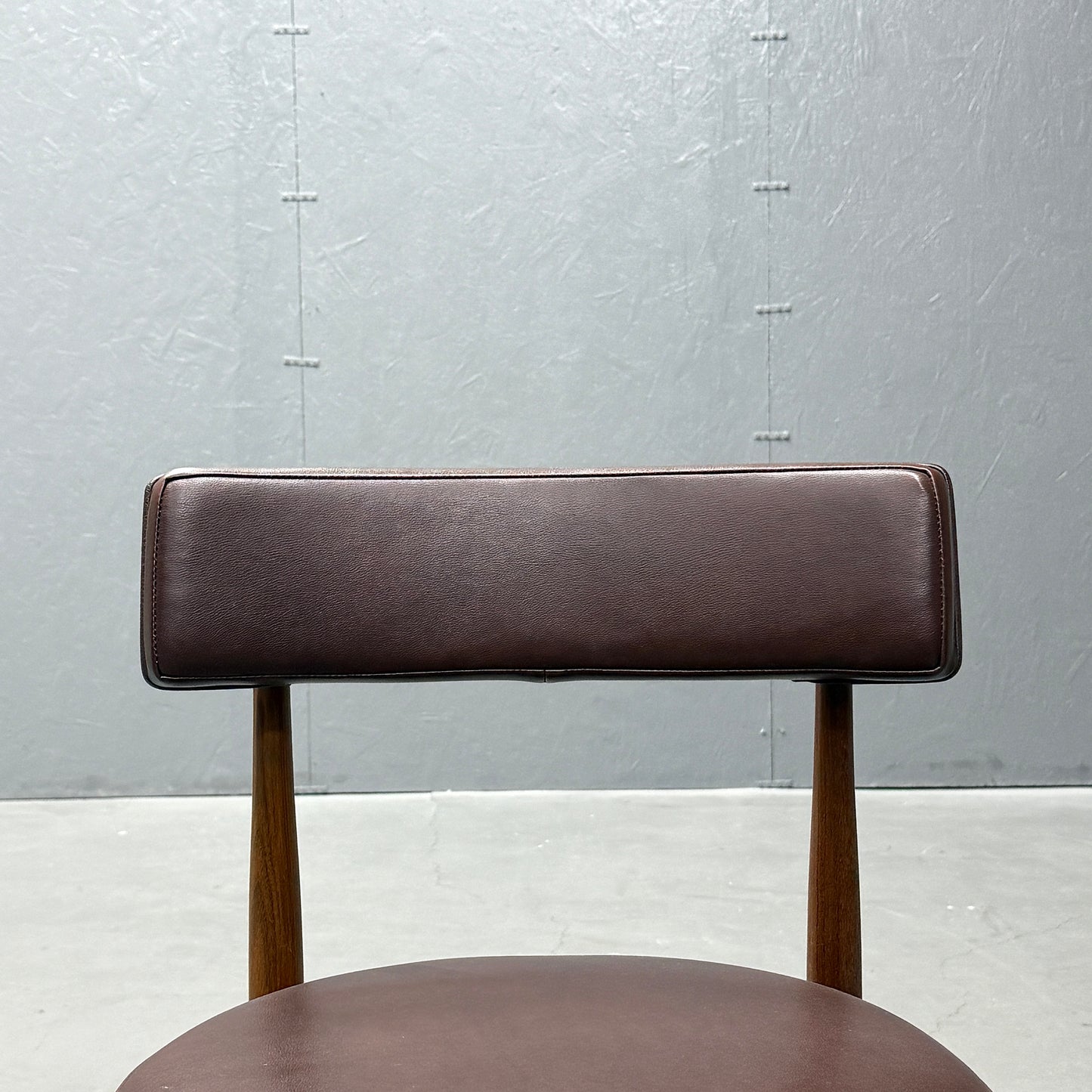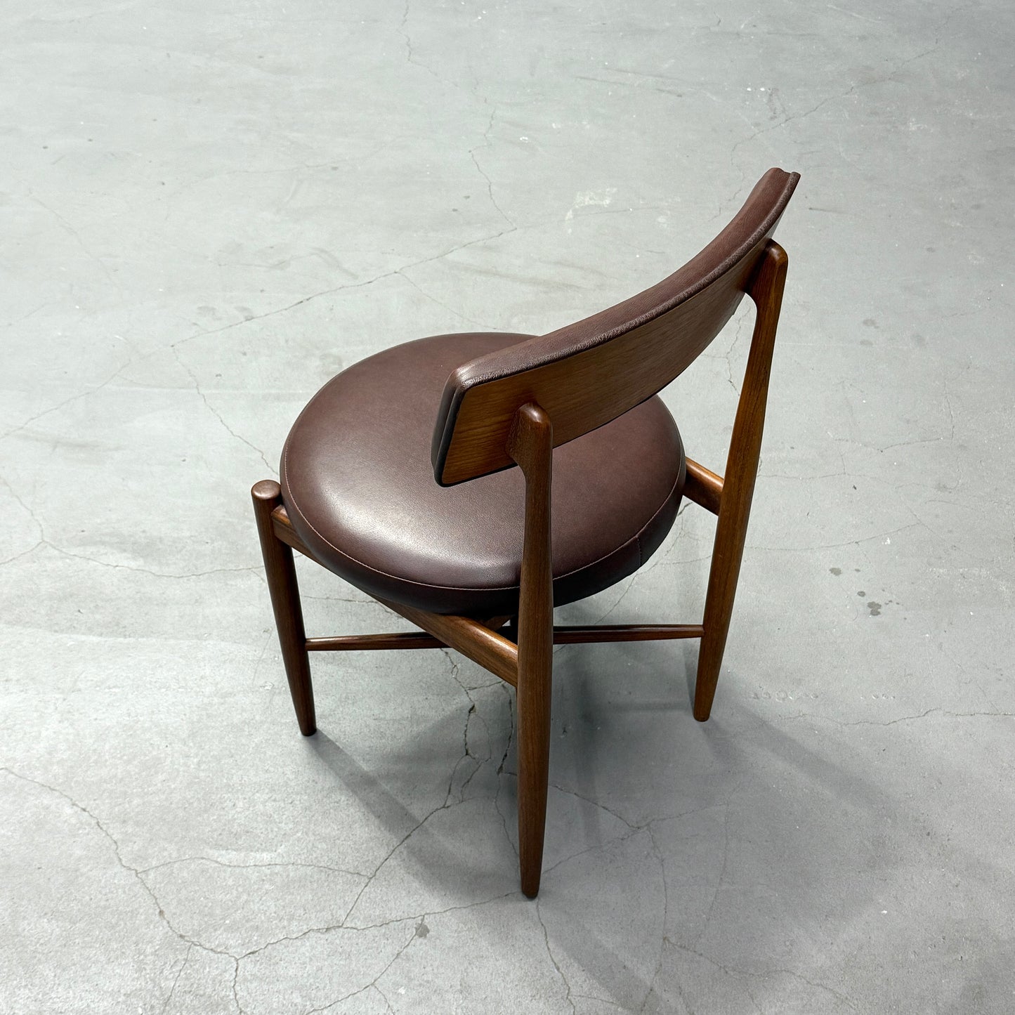 チーク材にブラウンビニールのシートベースと背もたれが付いたフレスコシリーズのサーキュラーチェアです。脚はテーパーしており、背もたれは緩やかなカーブを描いています。単体としてはもちろん、円形のダイニングテーブルとセットで組み合わせるとスカンディナビアンテイストが強まります。