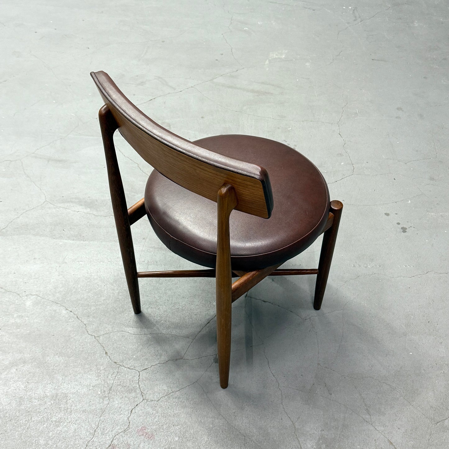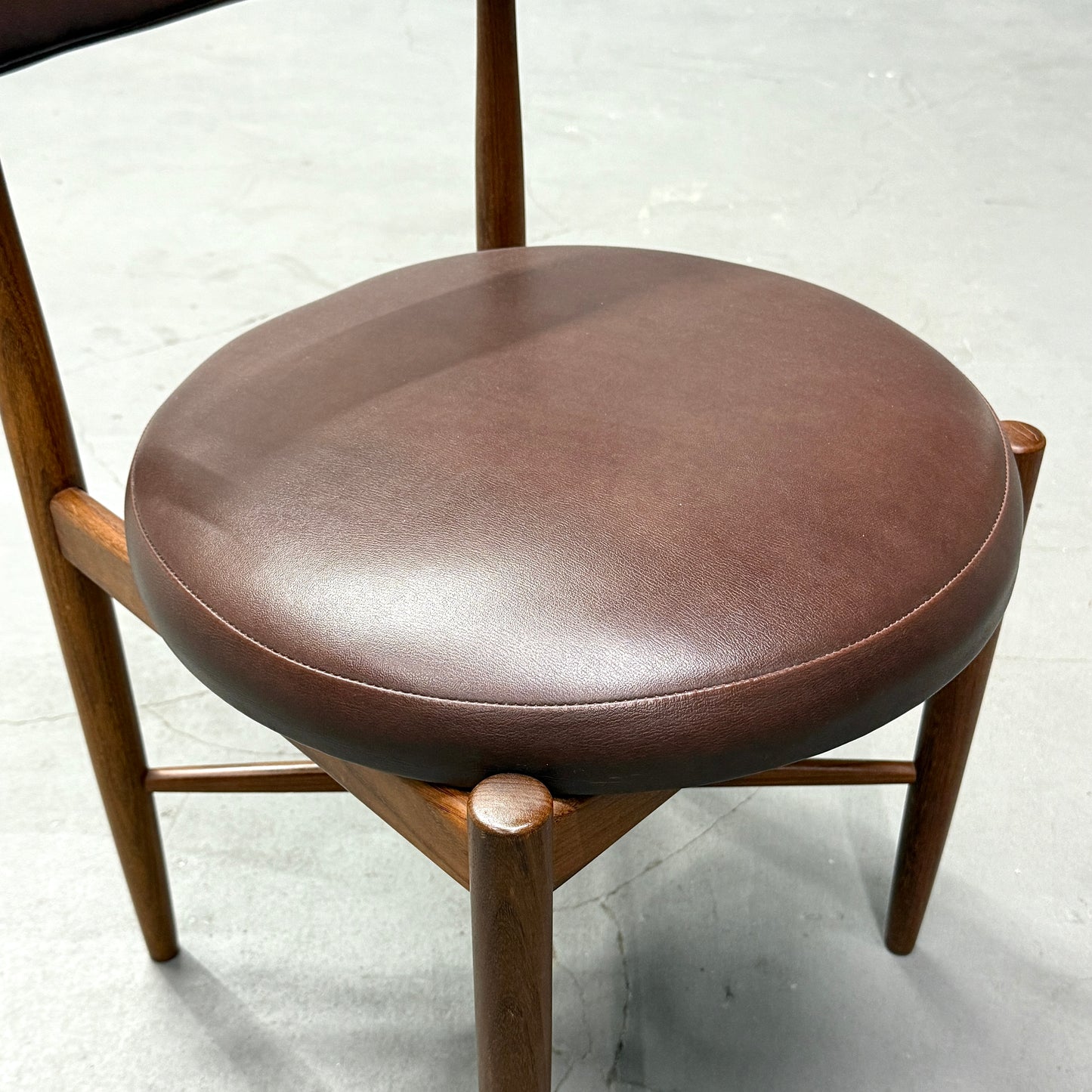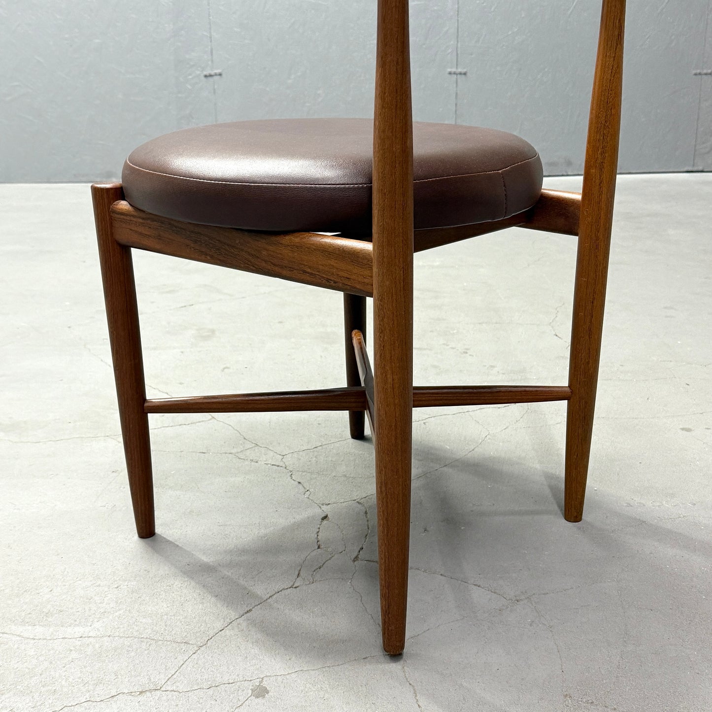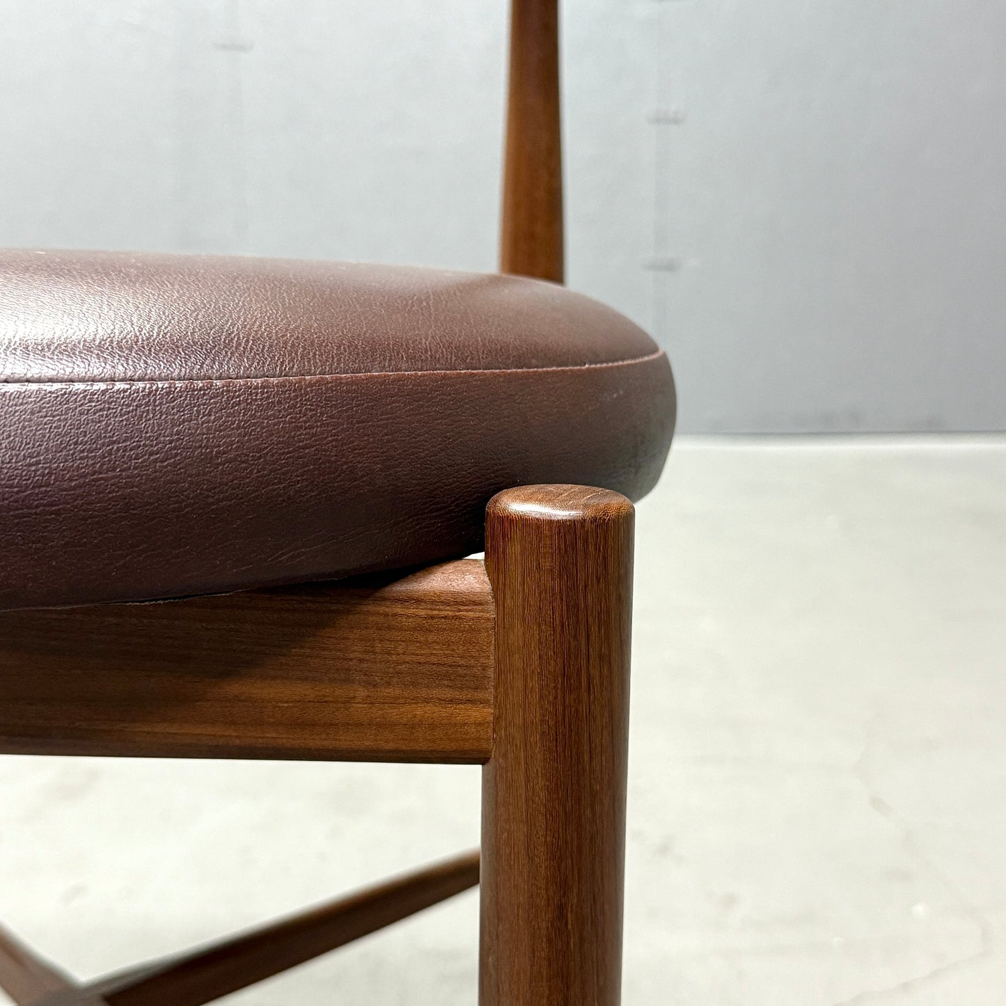 チーク材にブラウンビニールのシートベースと背もたれが付いたフレスコシリーズのサーキュラーチェアです。脚はテーパーしており、背もたれは緩やかなカーブを描いています。単体としてはもちろん、円形のダイニングテーブルとセットで組み合わせるとスカンディナビアンテイストが強まります。