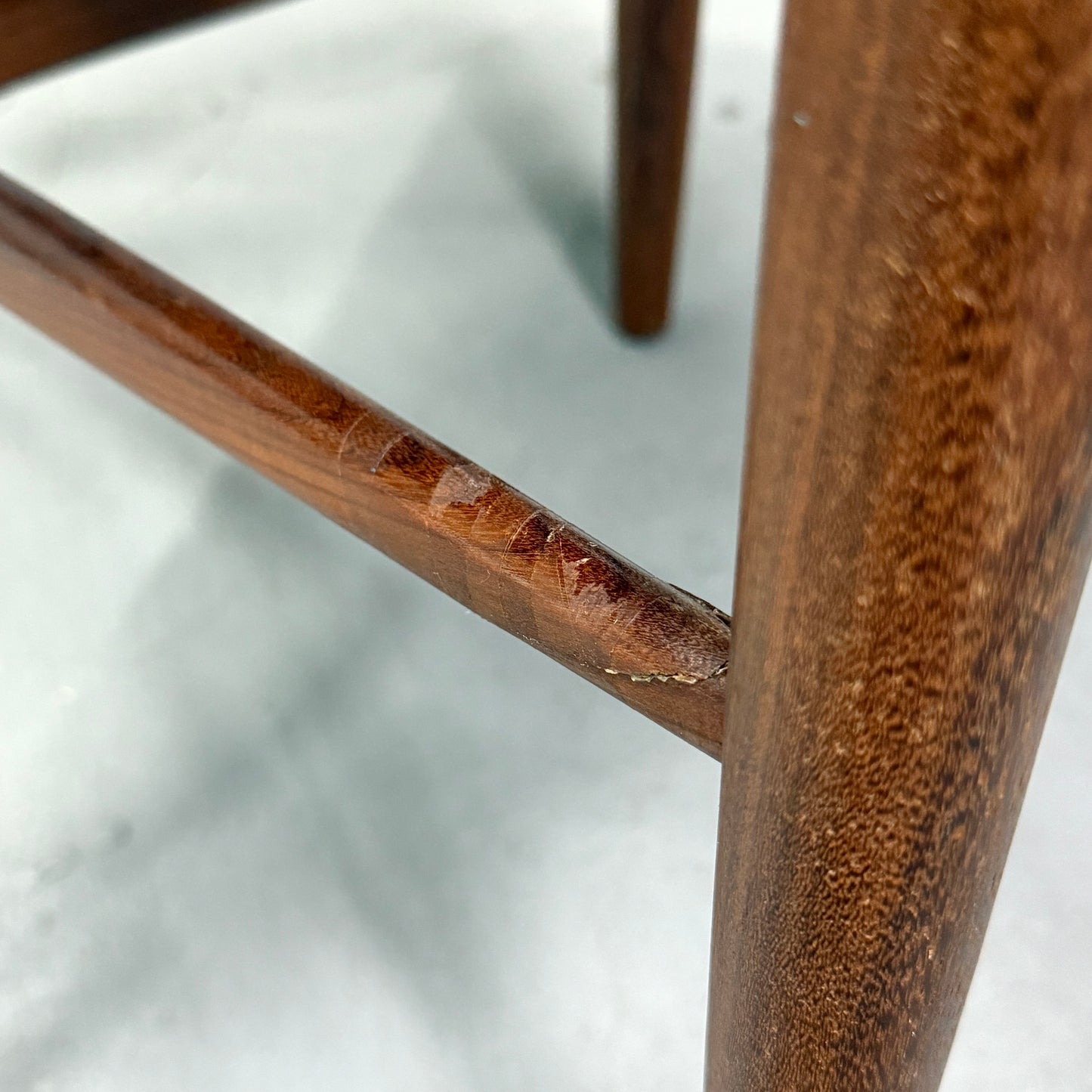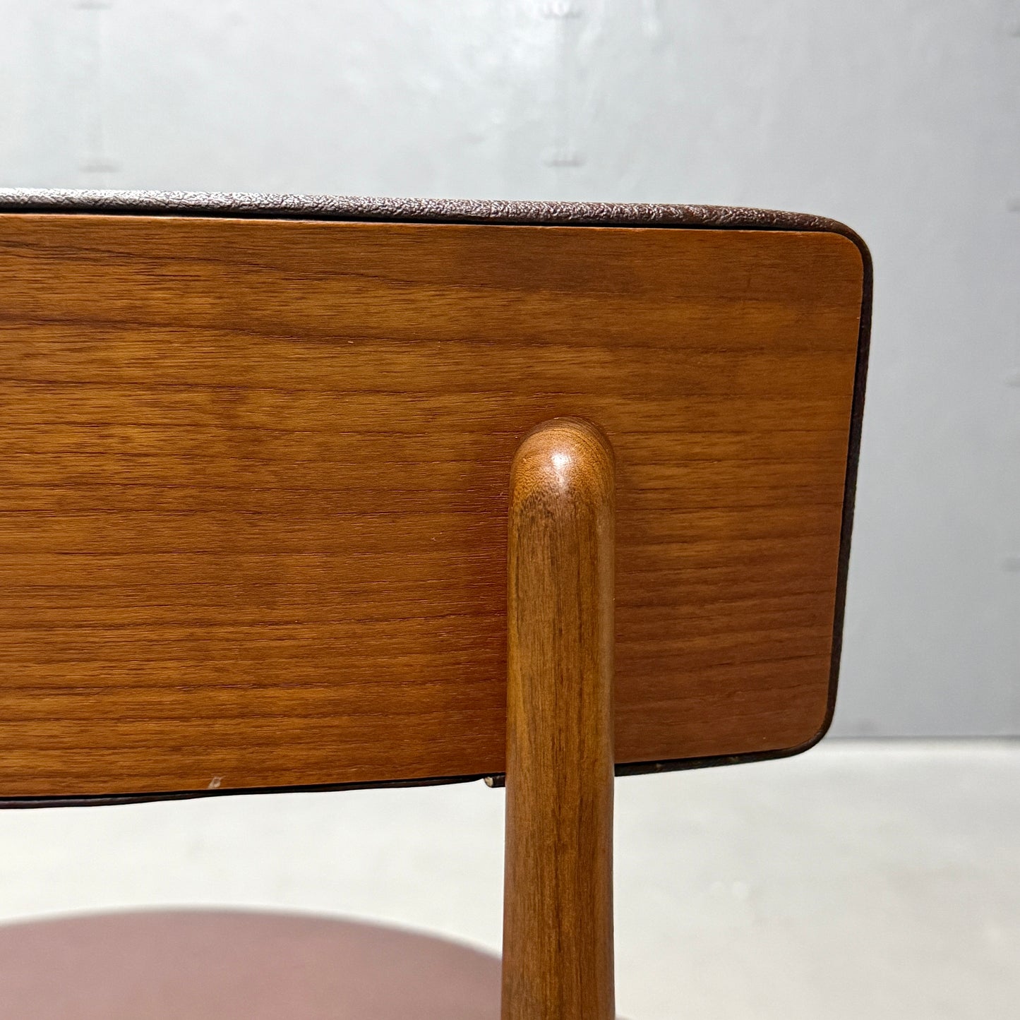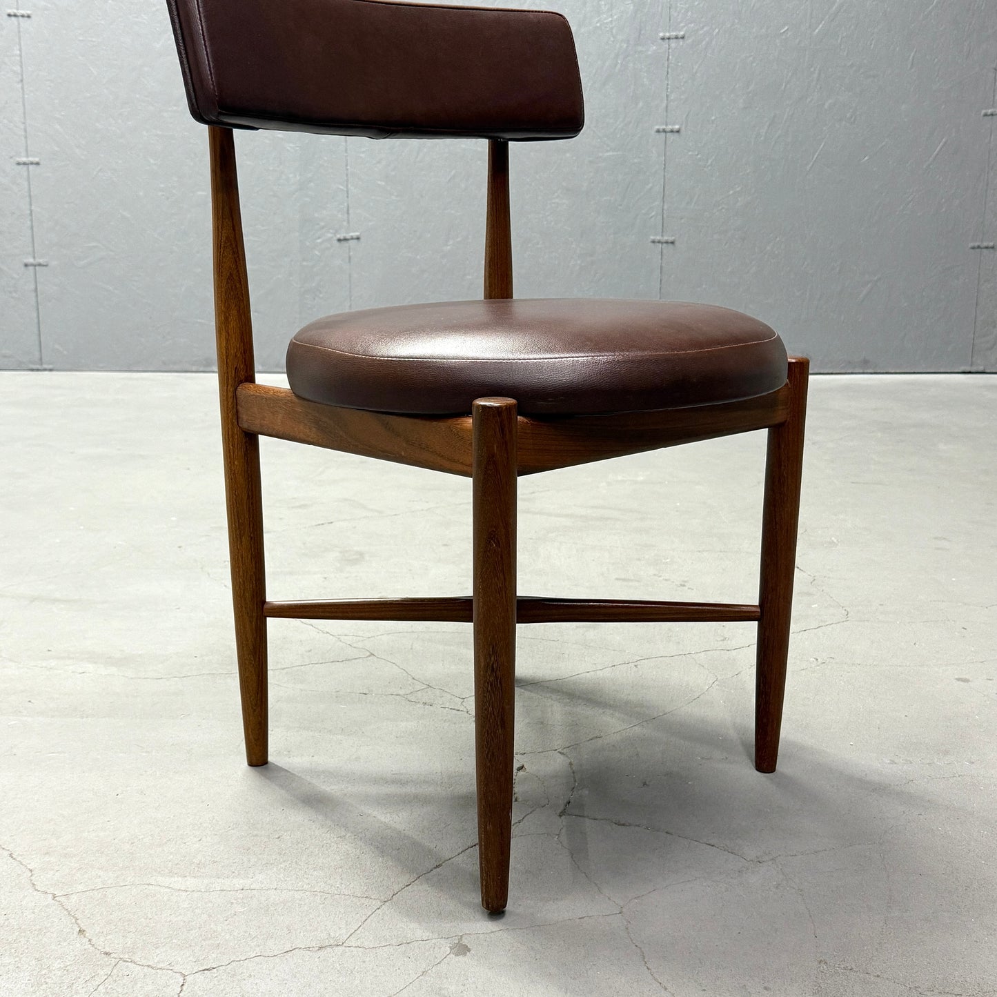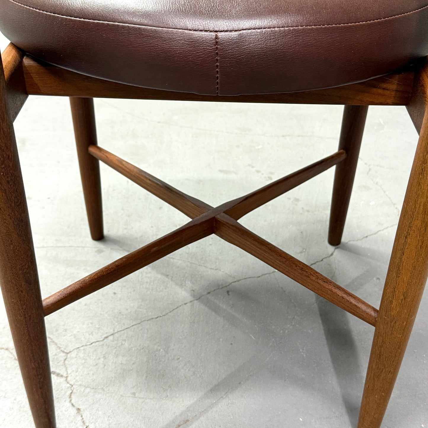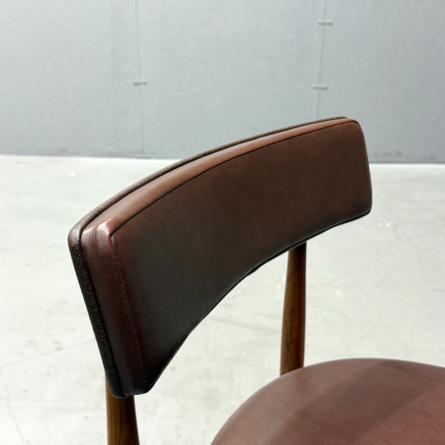 チーク材にブラウンビニールのシートベースと背もたれが付いたフレスコシリーズのサーキュラーチェアです。脚はテーパーしており、背もたれは緩やかなカーブを描いています。単体としてはもちろん、円形のダイニングテーブルとセットで組み合わせるとスカンディナビアンテイストが強まります。