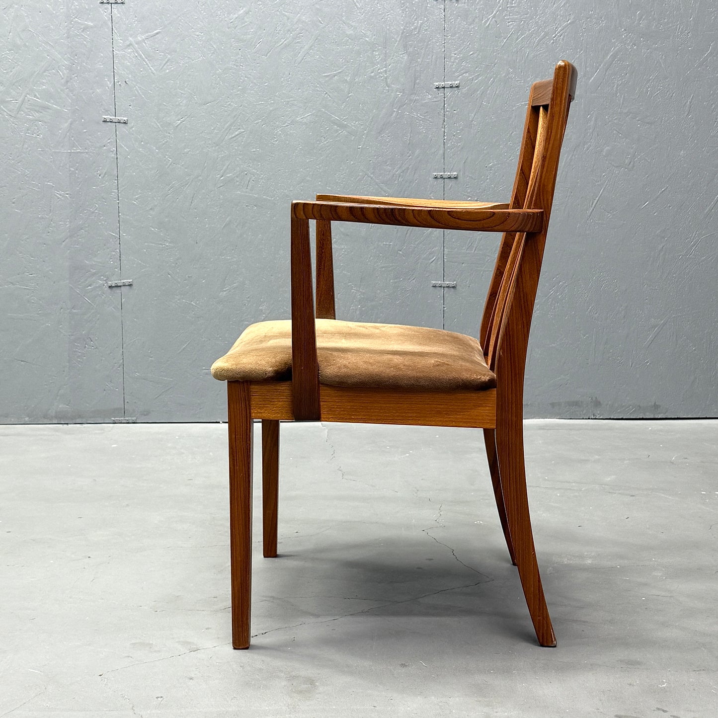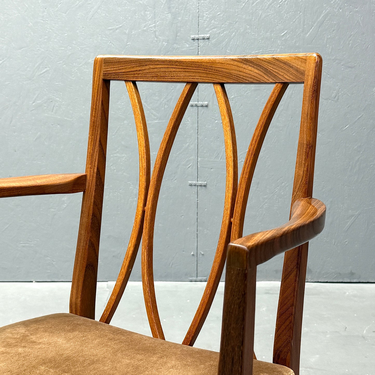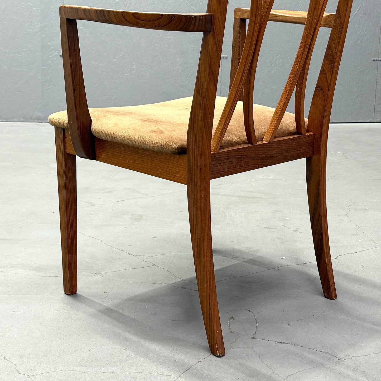 素材にはチーク材が用いられており、温かみのある木目と経年による深みのある色合いが魅力です。シートは落ち着いたトーンの張り地で仕上げられており、快適な座り心地とクラシックな雰囲気を演出しています。