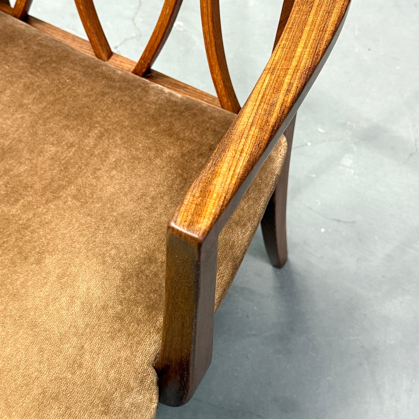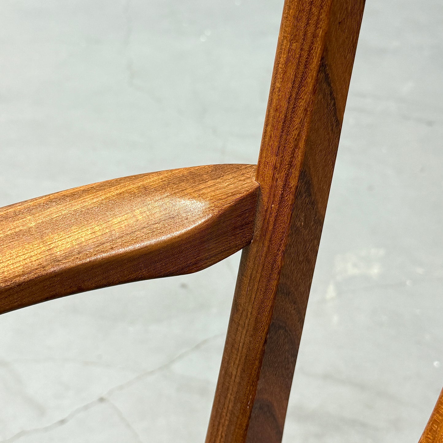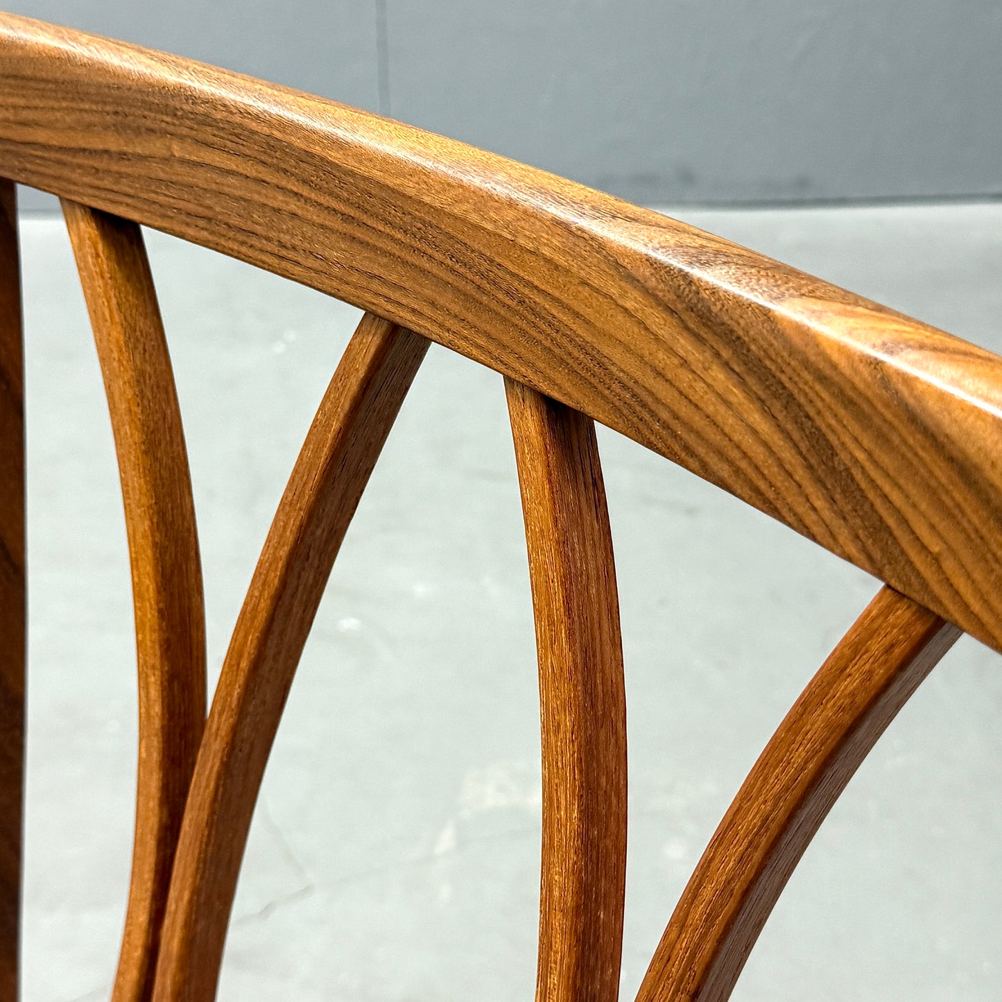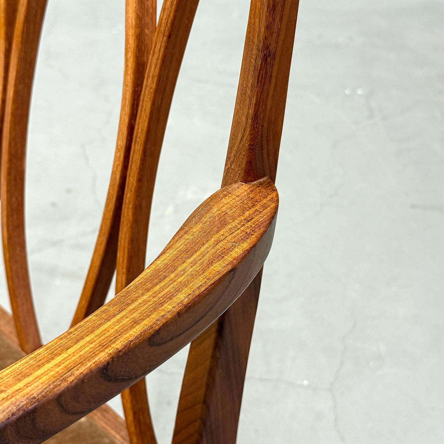 素材にはチーク材が用いられており、温かみのある木目と経年による深みのある色合いが魅力です。シートは落ち着いたトーンの張り地で仕上げられており、快適な座り心地とクラシックな雰囲気を演出しています。